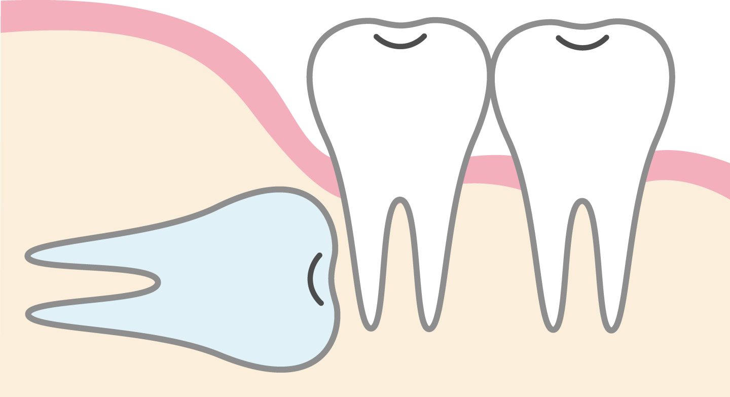 親知らずのなかでも抜歯の難度が比較的高いといわれるのが「水平埋伏智歯」。歯は自分が向いている方向へ生えようとする性質があるため、水平埋伏智歯があると手前にある歯を圧迫し、歯の根っこを溶かしてしまう「歯根吸収」が起きてしまう可能性も。抜歯の際は、歯茎を切開し、場合によっては骨を削る、歯を分割して取り出すなどの外科手術が必要になることがあります。