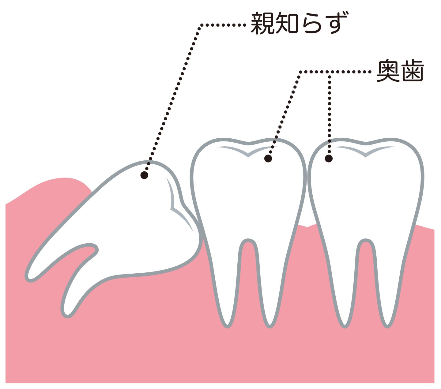 行き場がなくなった8番目の歯は、傾斜して生えたり、歯肉に埋まったまま埋伏したりすることも。半分だけ表に出てきているなど、歯の一部が見えている親知らずは「半埋伏(はんまいふく)智歯」、骨の中に完全に埋まって、レントゲンを撮らなければその存在がわからない親知らずは「完全埋伏智歯」、横向きになって埋まっている親知らずは「水平埋伏智歯」と呼ばれています。
