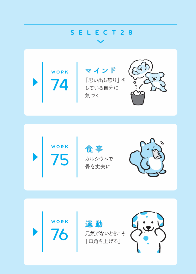 思い出して怒ったりしないで、ムカムカイライラしたら心地良い景色やあたたかい飲み物を飲むなどしてリラックスを。カルシウムは特に女性は摂取していきたいもの。イライラ対策にもぜひ。元気が出ないときは口角を上げて、幸せホルモンを分泌させちゃいましょう。どれも簡単にできること、ぜひ健やかなマインドのためにも実践してみて!