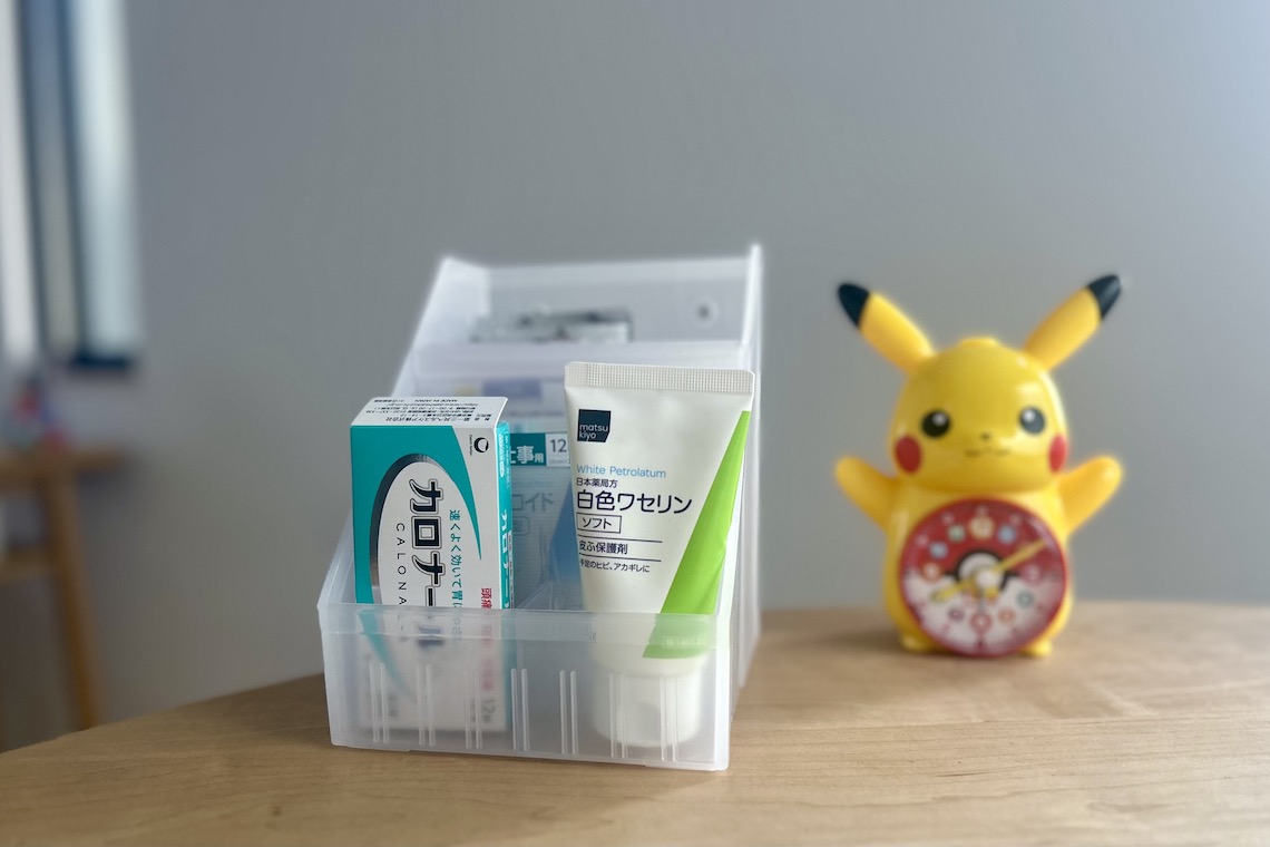 入れ物は、別に“箱”である必要はなく、わが家の場合は『無印良品』の中がうっすら透ける引き出しに入れています。家用と外出用を分けず、旅行にも丸ごと持って行けるよう、“救急箱”ならぬ“救急袋”にするのもおすすめ。ソフトな素材の袋なら、中身を適度に守ってくれますよ」