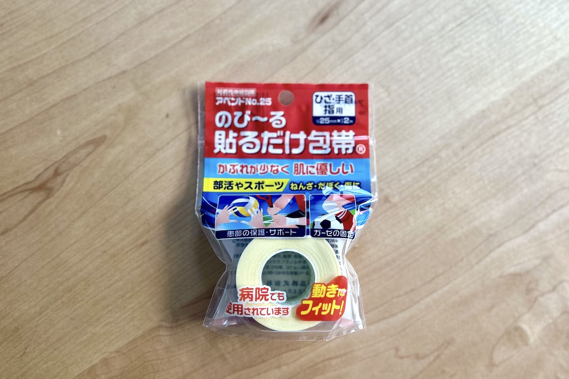 包帯は何でもよいそうですが、便利なのは「自着性包帯(じちゃくせいほうたい)」といい、巻くだけでくっつくタイプ。
