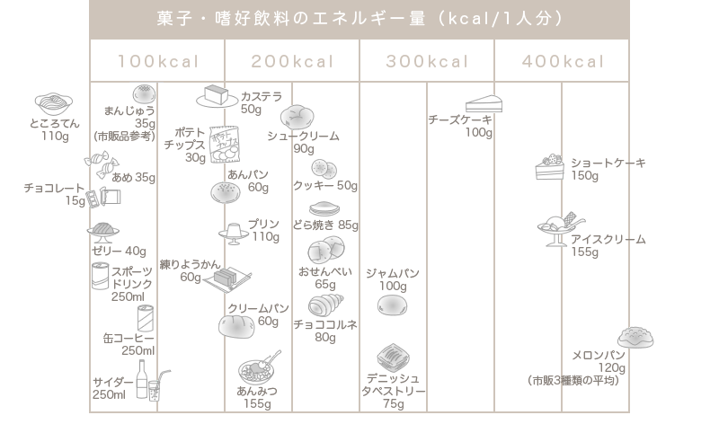 食事バランスガイドでは、菓子や嗜好品は1日200kcalを目安にすることを示しています。これには飲み物も含まれます。とりすぎないように注意しましょう。