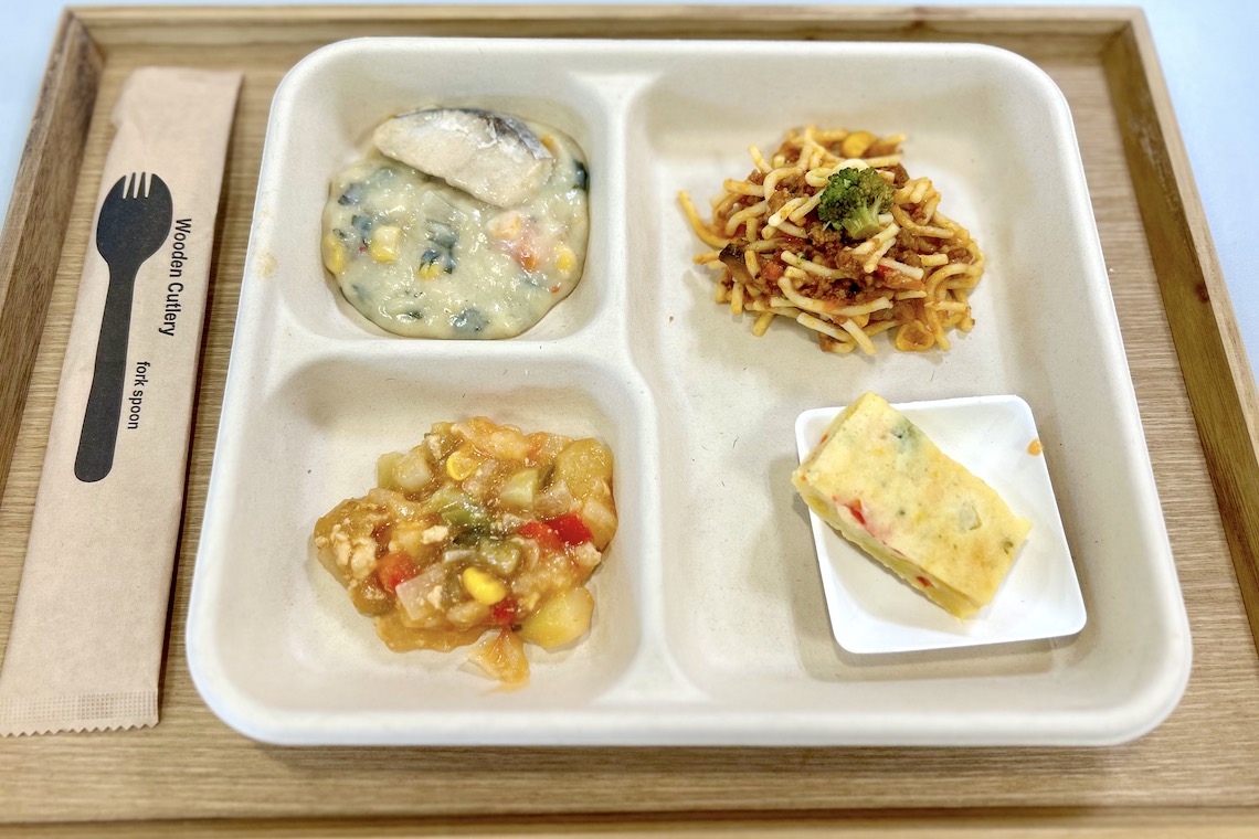 一足お先に試食。左上から時計回りに「さわらの豆乳シチュー」「ミートソーススパゲッティ」「米粉のお食事パンケーキ」「鶏のラタトゥイユ」。
