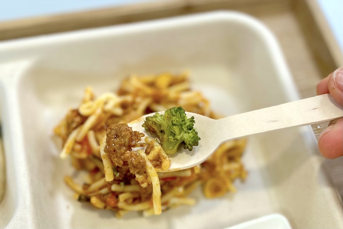 今回は「さわらの豆乳シチュー」「ミートソーススパゲッティ」「米粉のお食事パンケーキ」「鶏のラタトゥイユ」と4つのメニューを試食しました。