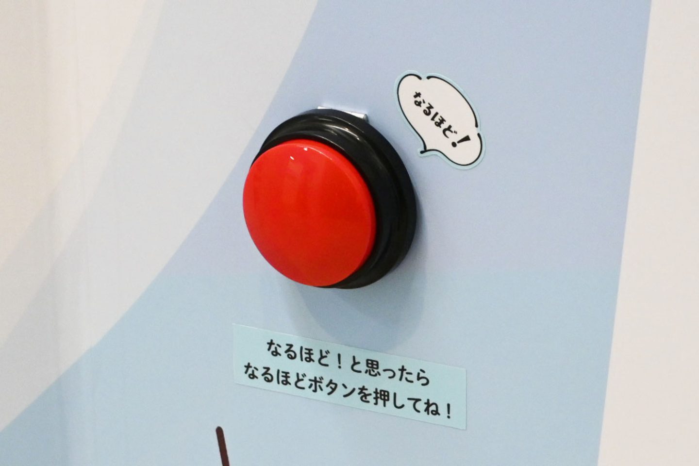 “なるほど!ボタン”は、展示会場内にいくつも設置されていて、ボタンによって言語や方言など違った「なるほど!」が流れるので、見つけるたびに押したくなってしまいます。