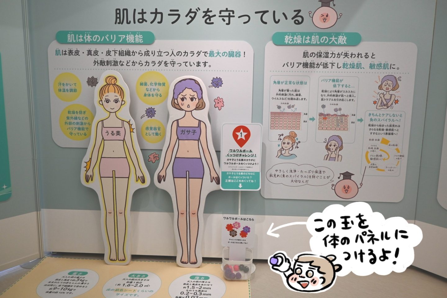 肌の乾燥にまつわるコーナーでは、しっとり保湿されている「うる美ちゃん」と乾燥している「ガサ子ちゃん」にホコリや雑菌を表す「ワルワルボール」をくっつけるチャレンジが。