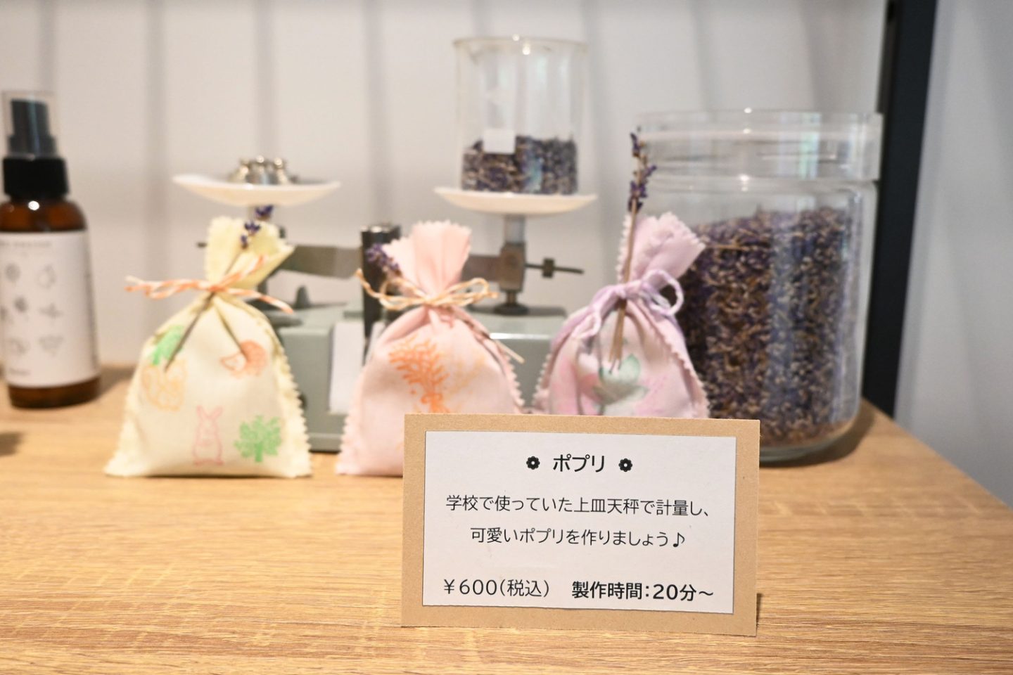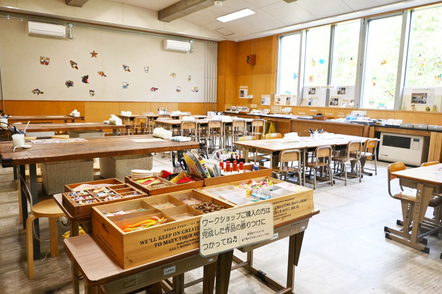 「森の工舎」の1階にある、教室をリノベーションしたワークショップ会場では様々なワークショップを毎日開催しています。希少な和ハッカなど、10種の精油から自分の好きな香りを選んで調合する、オリジナルアロマ作りや子どもが大好きなスライムやスノードーム作りなど、どれも楽しいものばかりです。