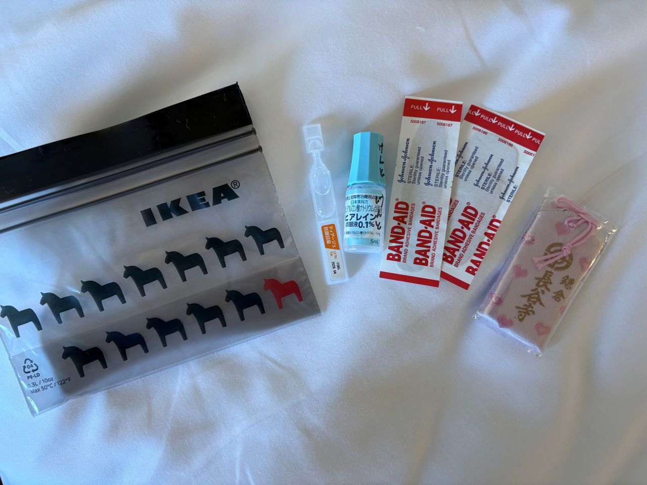 あと、薬はあれこれ持っておいて損はないので、風邪や発熱用の飲み薬・かゆみやかぶれの塗り薬・傷手当て用のテープなど、ビニールポーチにまとめて常備。