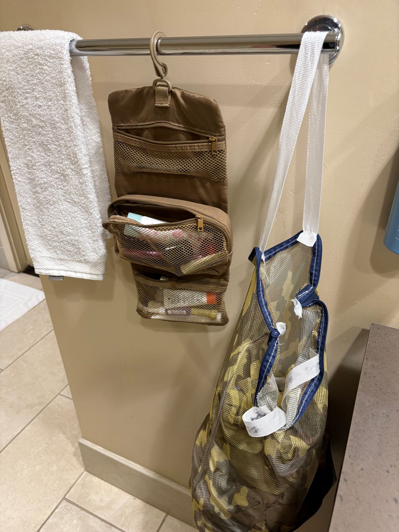 無印良品のトラベルポーチは、サイズ感といい使いやすさといい完璧! 浴室のタオル掛けやフックなどに吊るせるので、洗面台にコスメを広げなくて済むし、帰る日にバタバタと片づける手間も省けます。