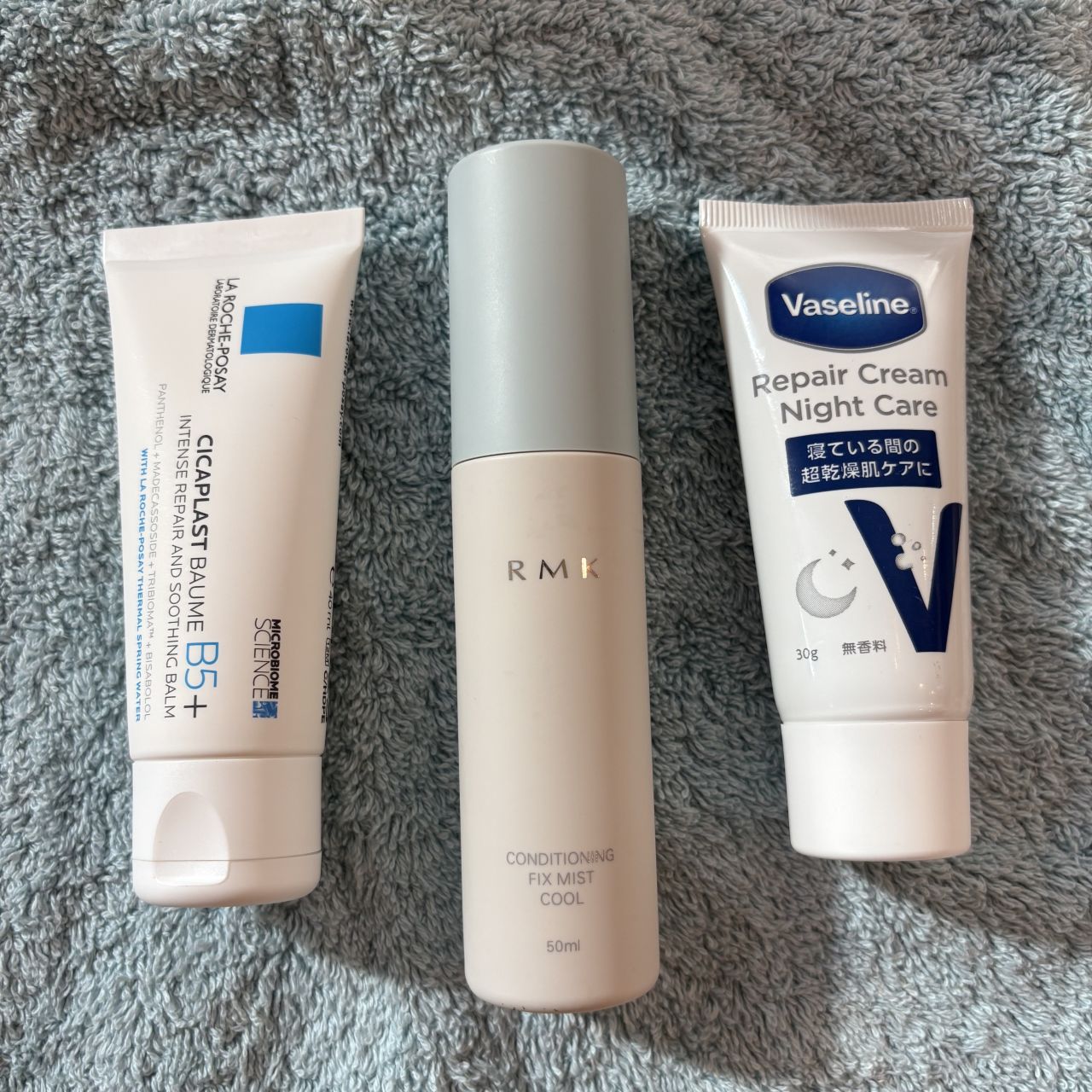 左から/ラ ロッシュポゼ シカプラスト リペアクリーム、RMK コンディショニング フィックスミスト クール、ヴァセリン リペアクリーム ナイトケア