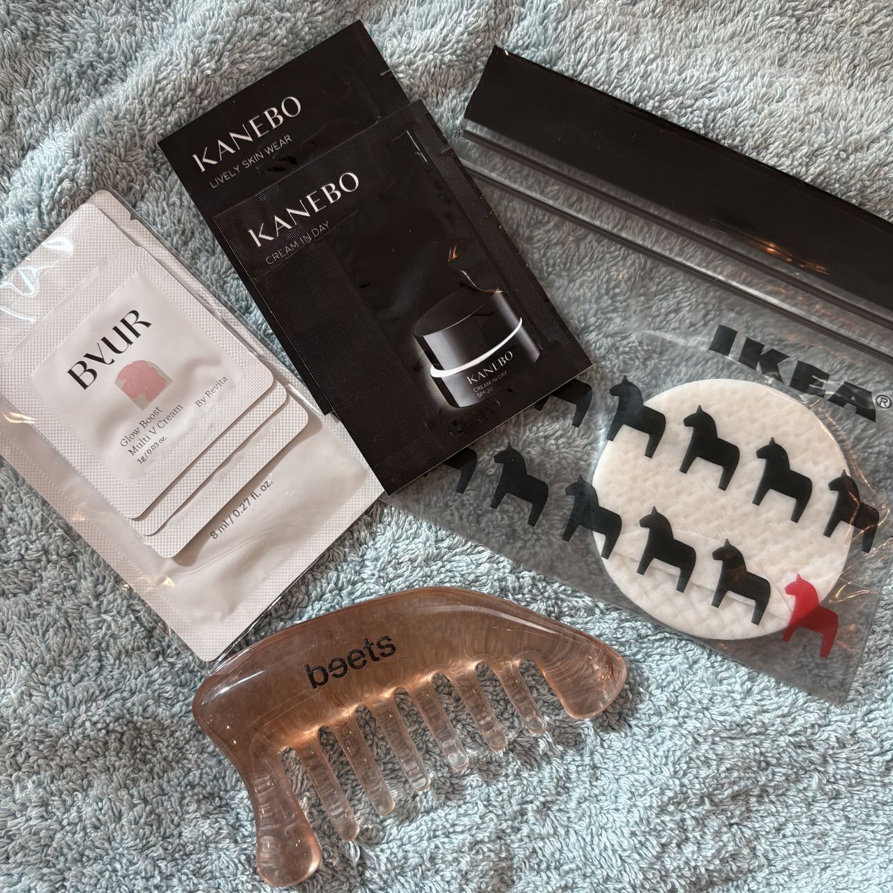 顔はラロッシュポゼ、ボディはヴァセリン、短時間のフライトや新幹線移動のときは、メイク+保湿効果のあるRMKのフィックスミストを使用。これらのアイテムは乾燥しがちなホテルの客室でも活躍します。