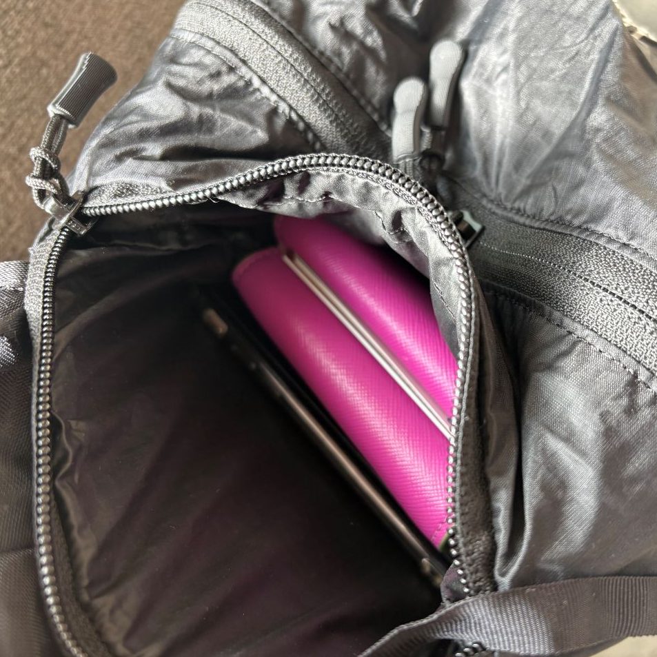 ドリンクなどが入れられる2カ所のサイドポケットのほか、上部の内側にはスマホやお財布がしまえるファスナー付きポケットも!