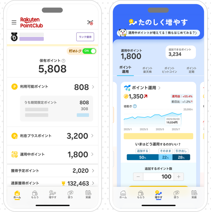 「私は通常ポイントを投資に回していまして、『増やす』タブをタップすると右上に通常ポイント数が出てくるので、そこが100ポイントになったらすぐに投資するというのが日課になっています。アプリリニューアルで通常ポイントの確認が簡単になりました」