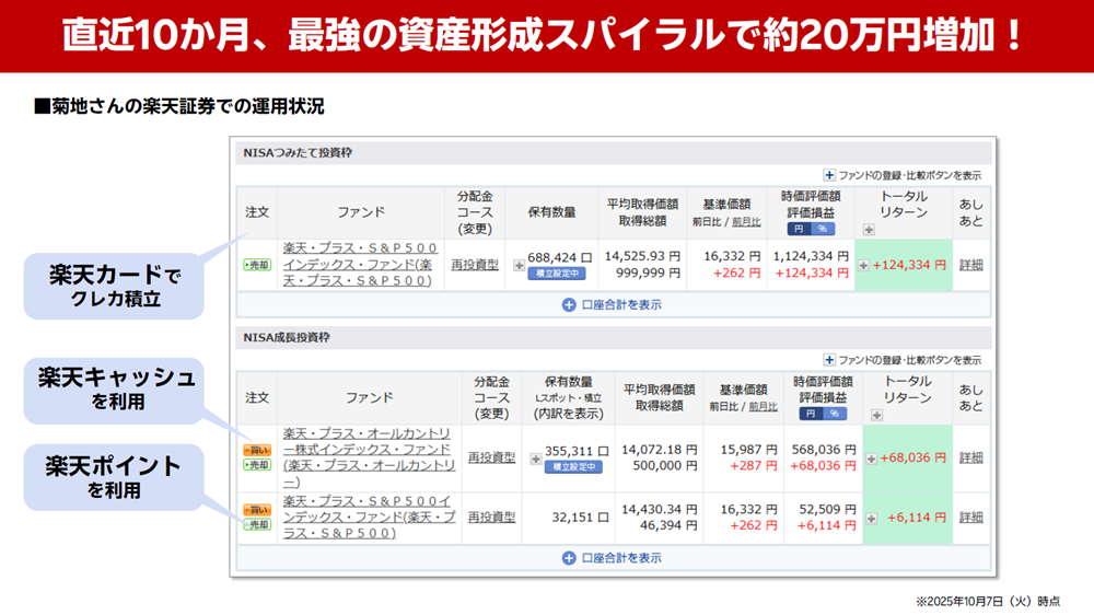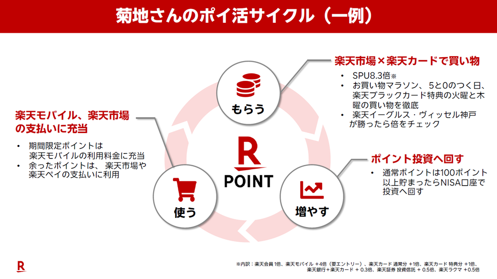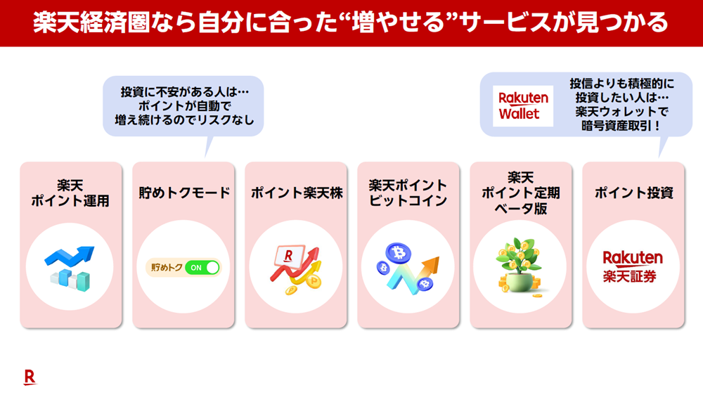 「旅行や子どもの学費、老後の蓄えなど、投資で資産を増やしたいけれどやはりハードルが高いと二の足を踏んでいる方こそ、ハードルを下げるためにポイント投資からスタートしてはいかがでしょうか。無理なく自分の投資スタイルを確立させることができるのは、これだけ豊富なメニューがある楽天経済圏ならではの強みだと思います」
