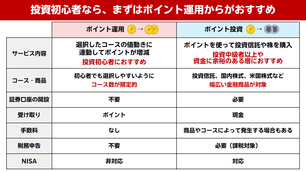 ポイントを使って購入するというだけで、仕組みは通常の投資と同様なので、証券口座の開設が必要で、商品やコースによって手数料が発生する場合もあり、課税対象となります。こちらは投資中級者以上や、資金に余裕のある人向けです。