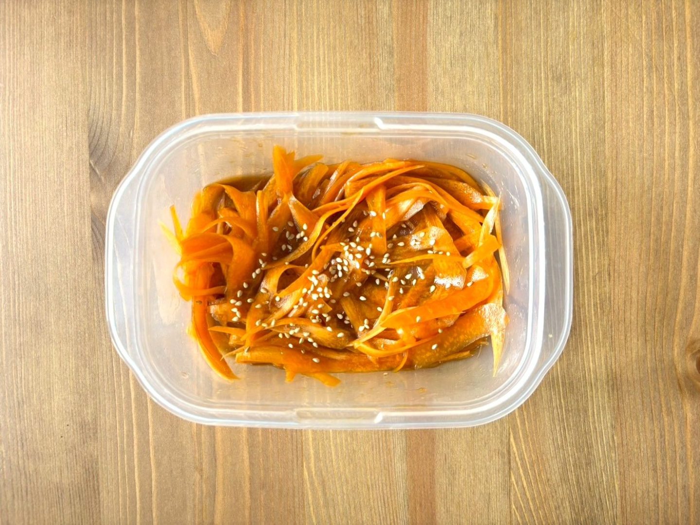 (2)にんじんに醤油、みりん、胡麻油、白いりごまを加えて混ぜる。
