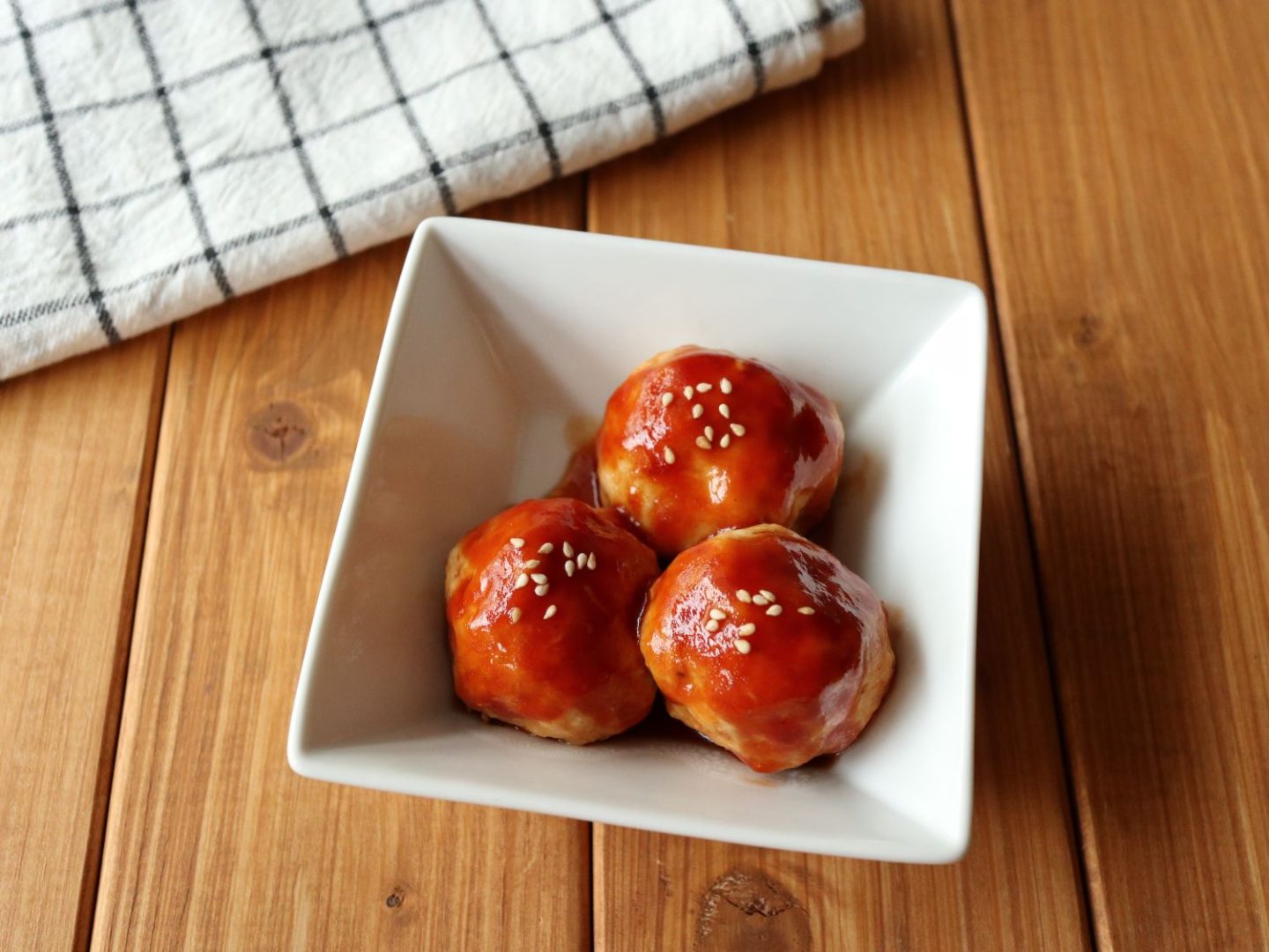 ケチャップベースの甘酢ダレとふんわり肉団子が相性抜群。つなぎは卵不使用で、マヨネーズと片栗粉で仕上げます。最初に肉団子を加熱するときは、固くなりすぎないよう500Wで少しゆっくりめに熱を通しています。