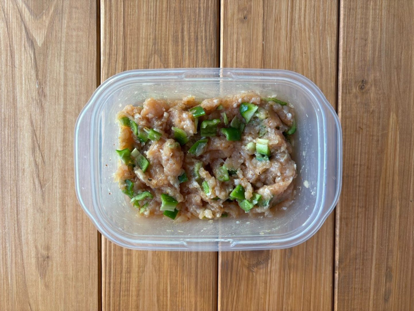 (2)鶏ひき肉と<調味料>を混ぜ、さらにピーマンを加えて混ぜる。