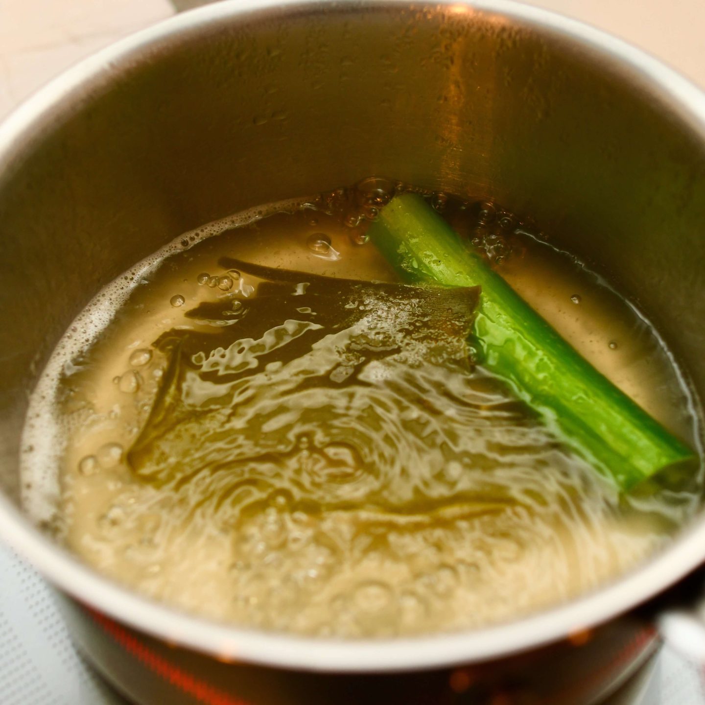 ふつふつしたら弱めにして3〜4分。昆布・ねぎは取り出します。
