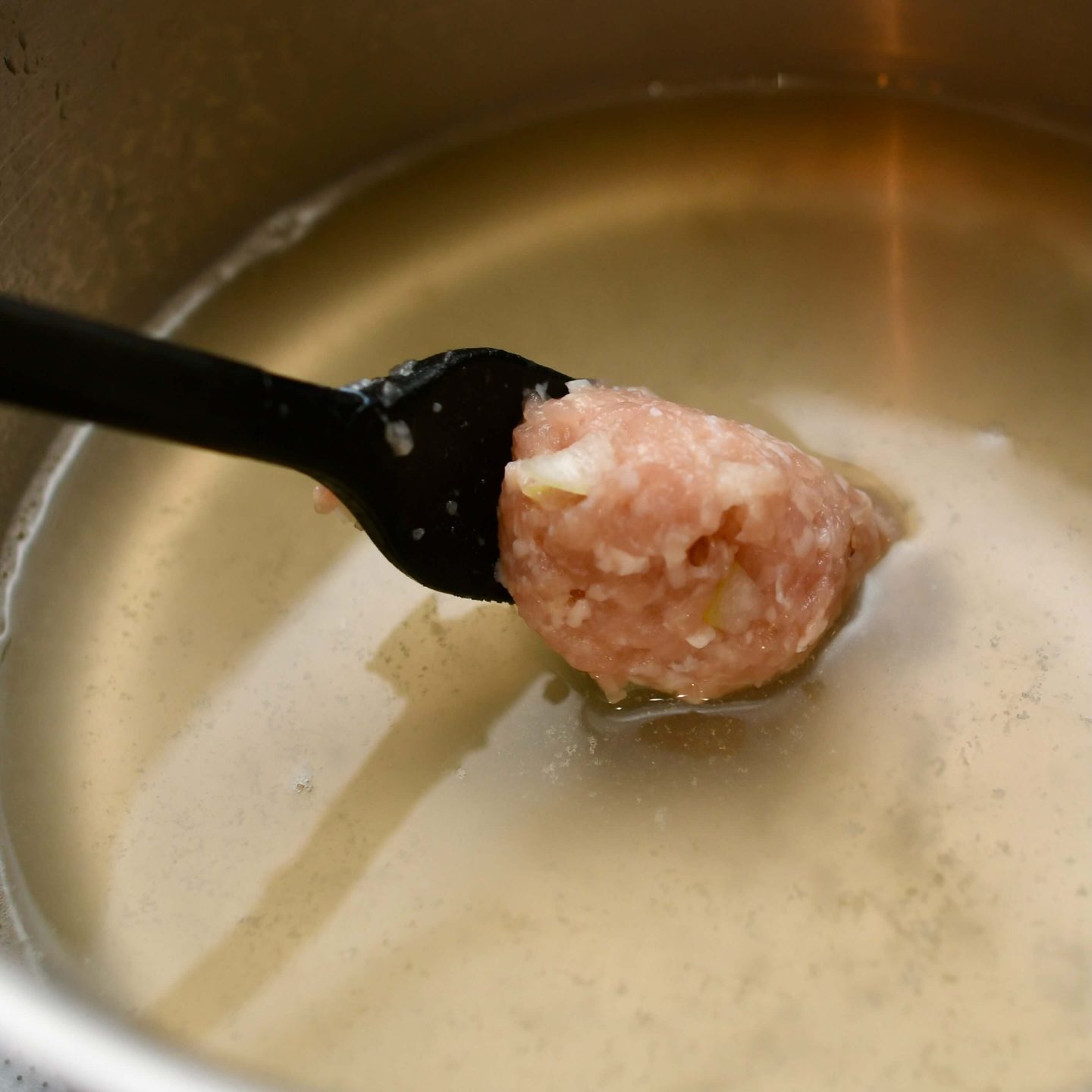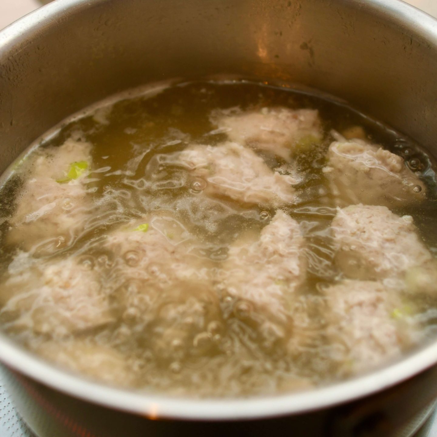 ボウルに鶏だんごの材料を全て入れ、よく混ぜ、スプーンで一口大にしてスープへ入れます。スープがふつふつと湧いている状態で、弱めの中火で3〜4分。鶏団子が浮いてきたら火入れはOK。