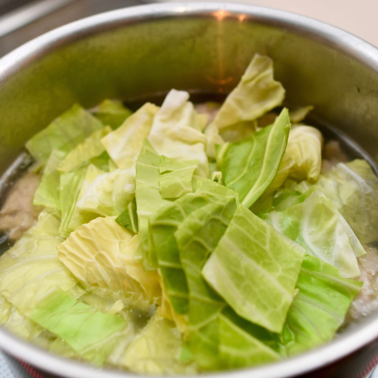 キャベツをスープに加え、“30〜60秒だけ”火を通して、取り出します。