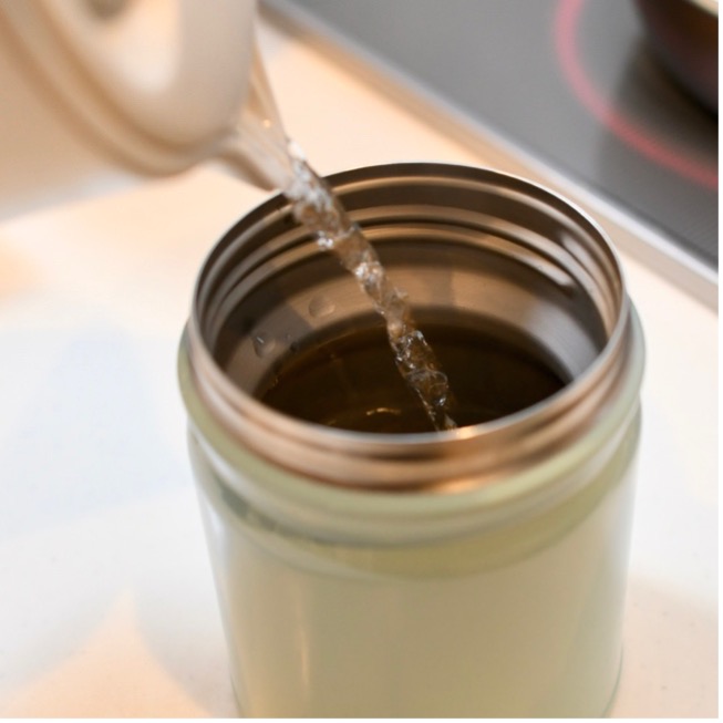 スープジャーに熱湯を満たしてフタをし、保温・殺菌しておきます。