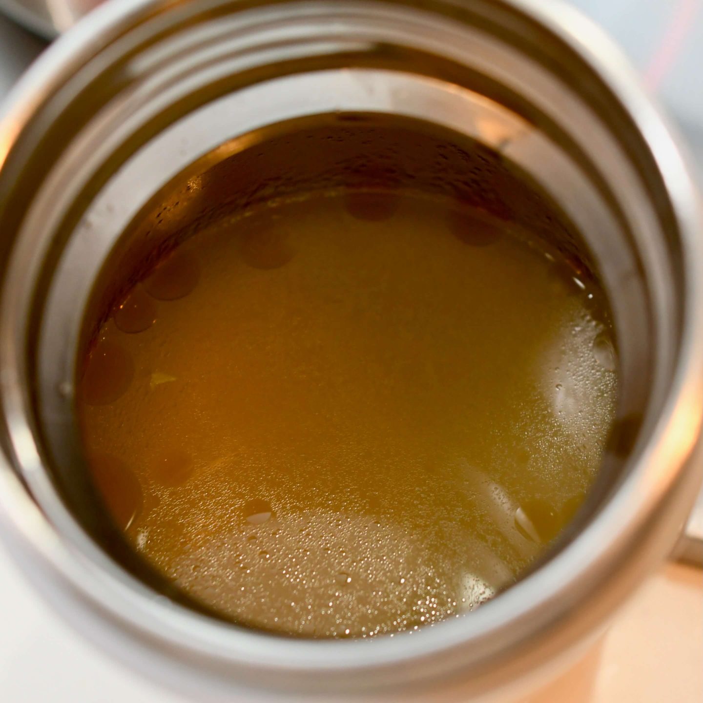 余熱用のジャーの湯を捨てたら、スープを再沸騰させます。熱々のスープを肩口まで注いだら、香り付けと保温の補助にゴマ油を少量入れ、すぐに蓋を閉めます。