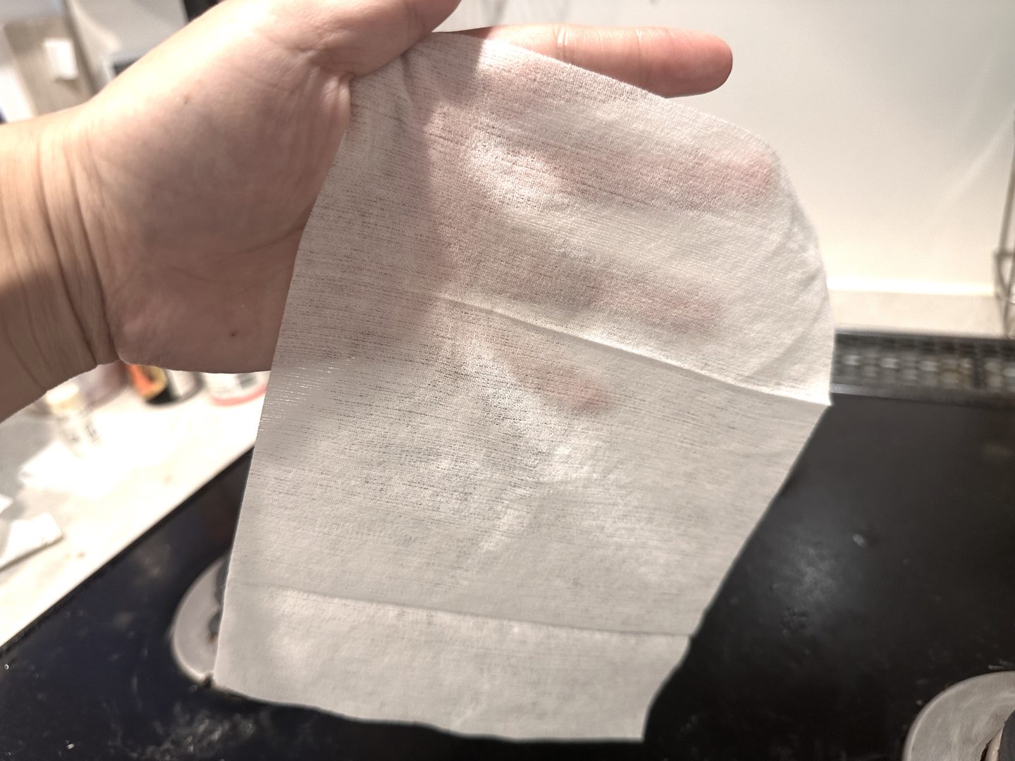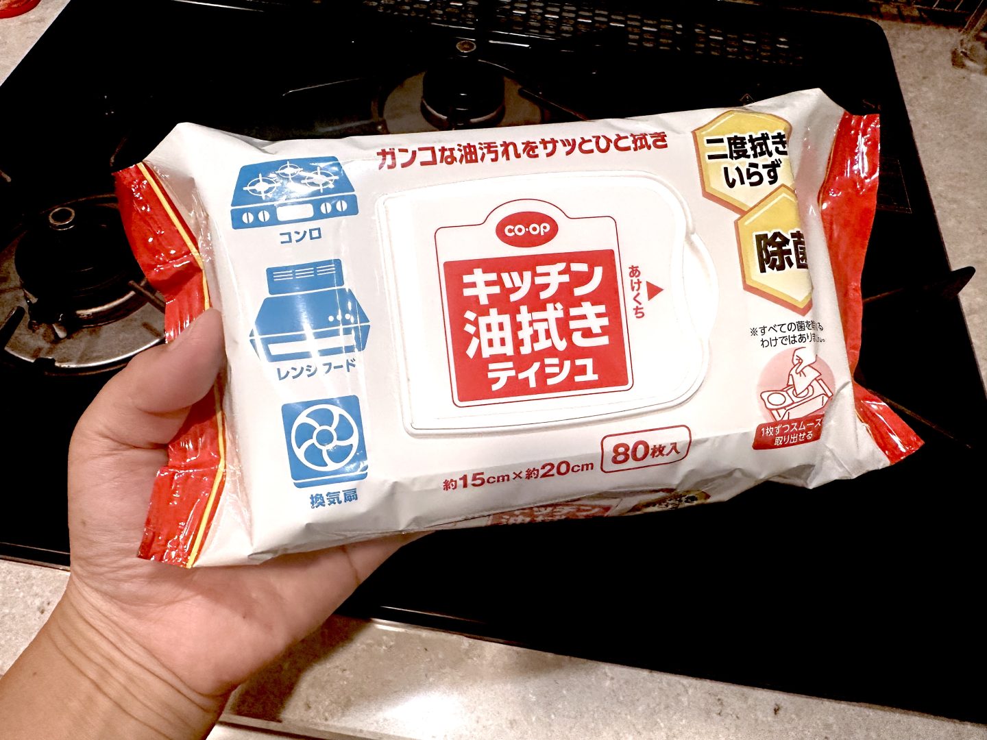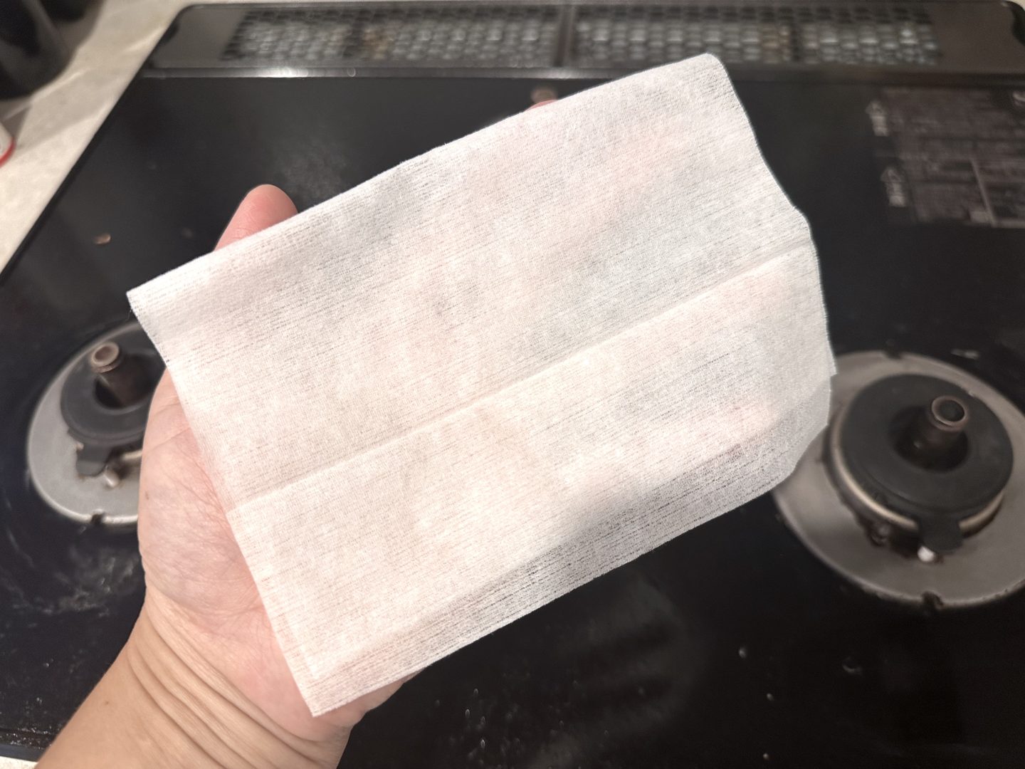 シートの大きさは、約15cm×約20cmの大判で、広げると結構大きくて、これを半分に畳んで拭くのが、私のおすすめです。畳むことで厚みが出るので、シートに含まれた成分がたっぷりガス台につく感じ。ひと拭きでキュキュッと汚れが気持ちいいほど取れるんです。