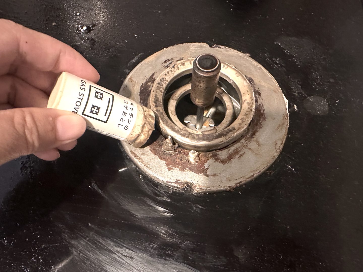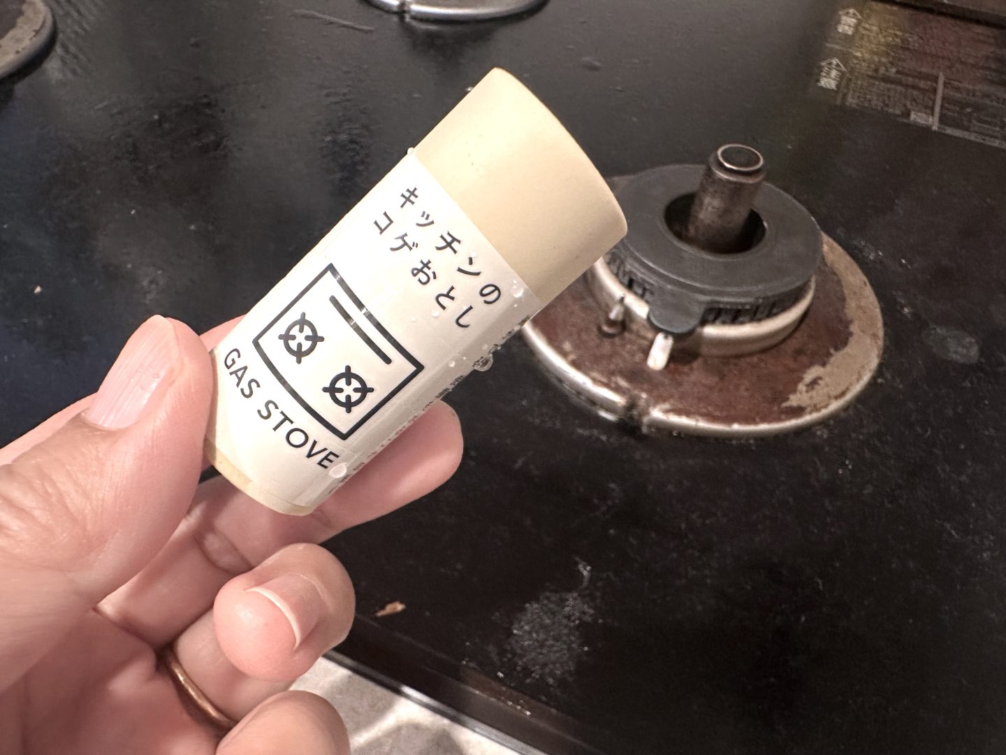 さらに、写真を撮るにあたり、吹きこぼれによるガス台のコゲつきもひどすぎるので(泣)、こちらは以前から気になっていた『CAINZ』の「カインズ 水をつけて擦るだけ キッチンのコゲおとし スティック状」を使ってみました。