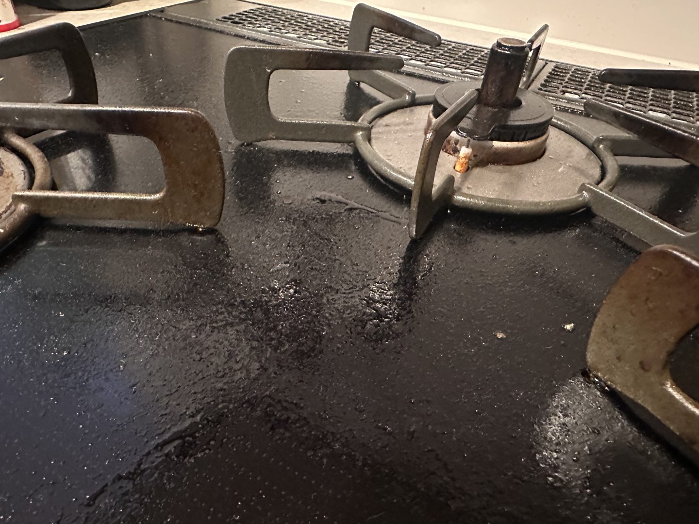 今回は、この油拭きティシュの実力をお伝えするために、我が家のコンロの油汚れを数日放置しておきました(と言いつつ、何日か放置してしまうこと、よくあります。泣)