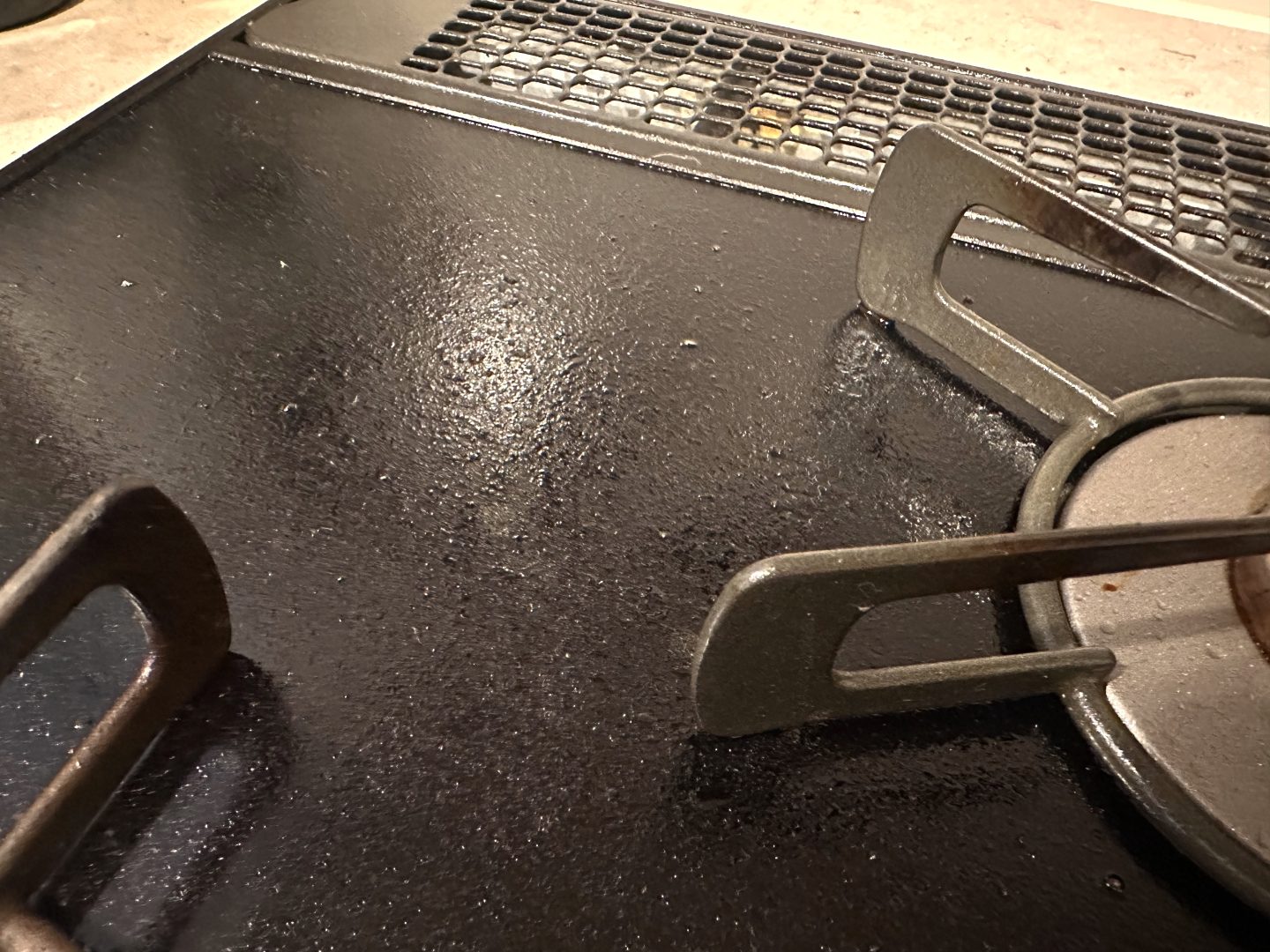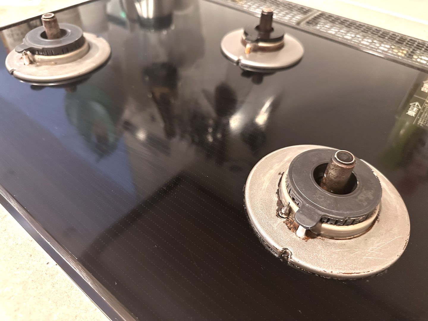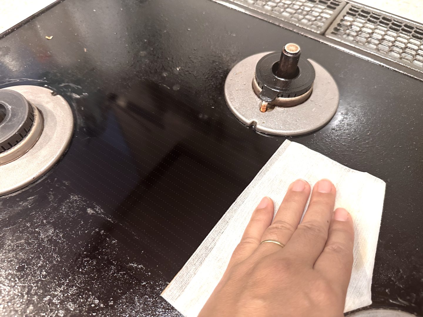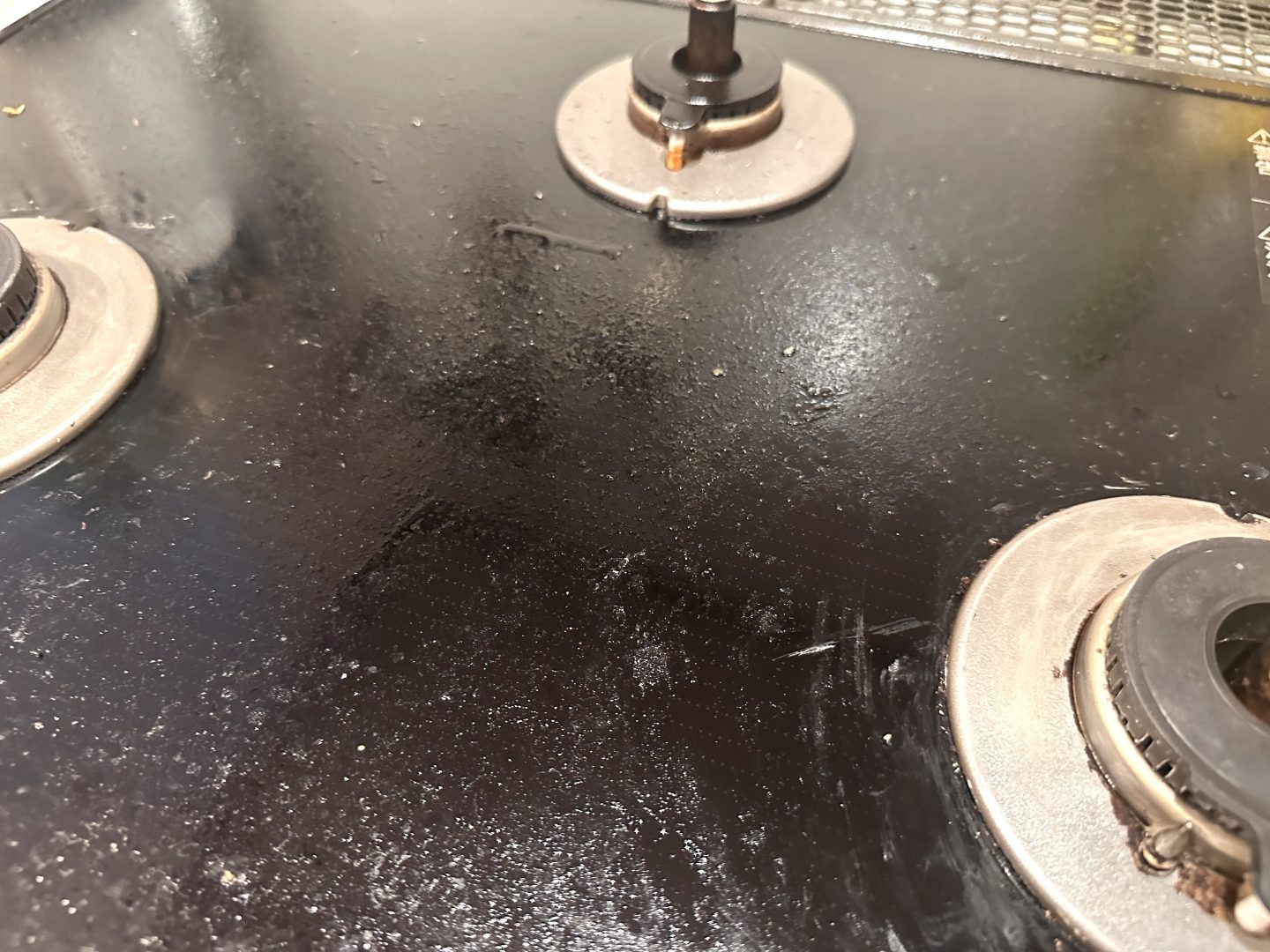 どれだけ油ハネを溜め込んでいたんだ……という感じですが、まるで曇りガラスのようだった面が、拭いた部分だけキラキラと輝きを放ちました!