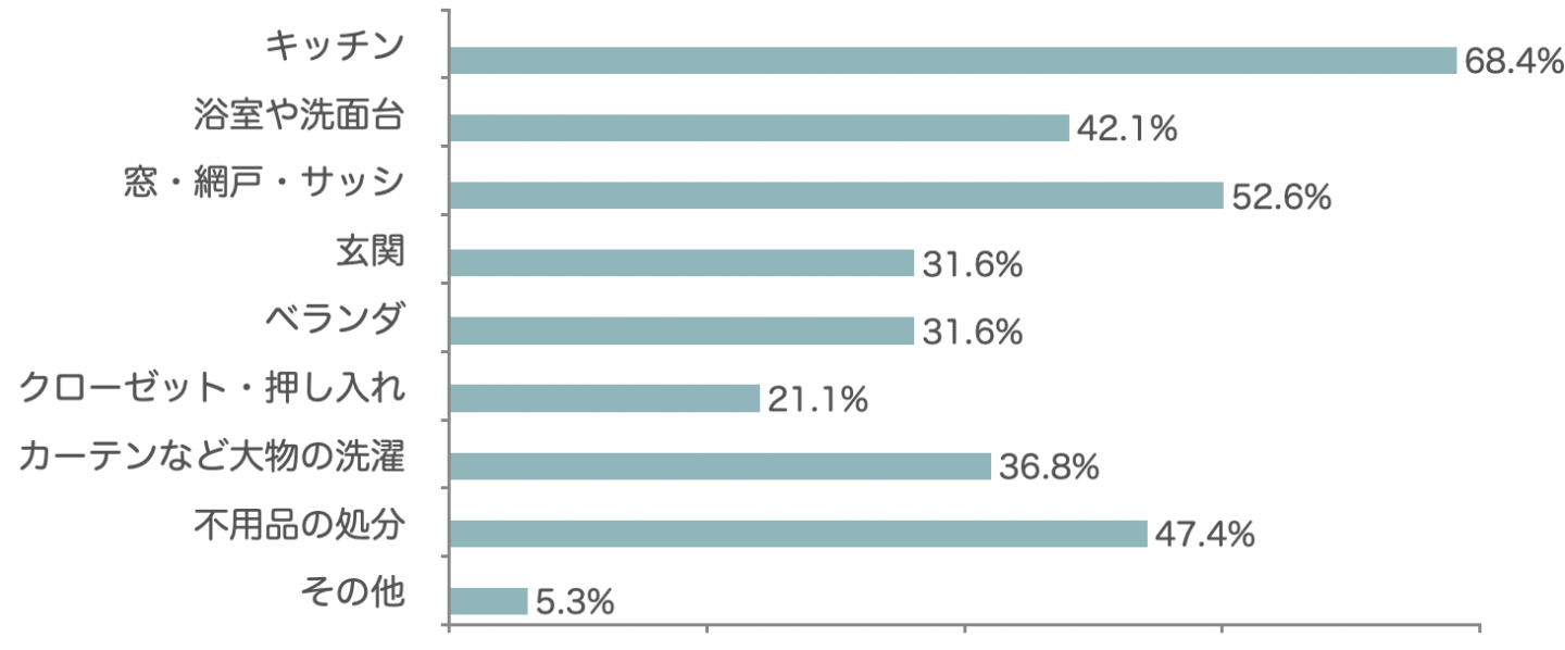 最も多かったのが、「キッチン」、次いで「窓・網戸・サッシ」、「不用品の処分」と続きます。ずば抜けて多いというものはなく回答は分散しましたが、なんとなく水回りの掃除する人が多い印象ですね。