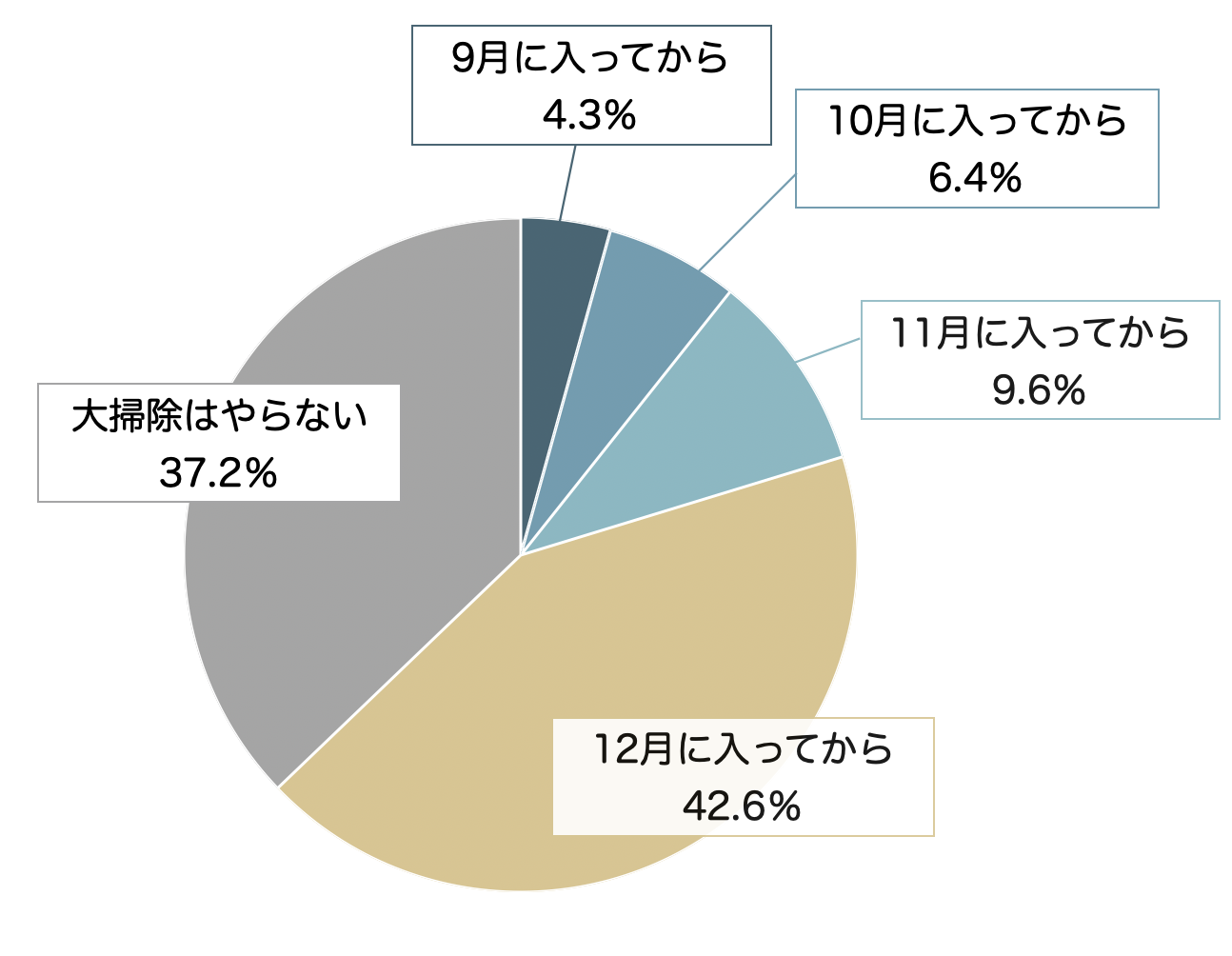 全体的にみてみると、12月より前に大掃除に取りかかる方は全体の約2割ほどと少数派であることが分かりました。