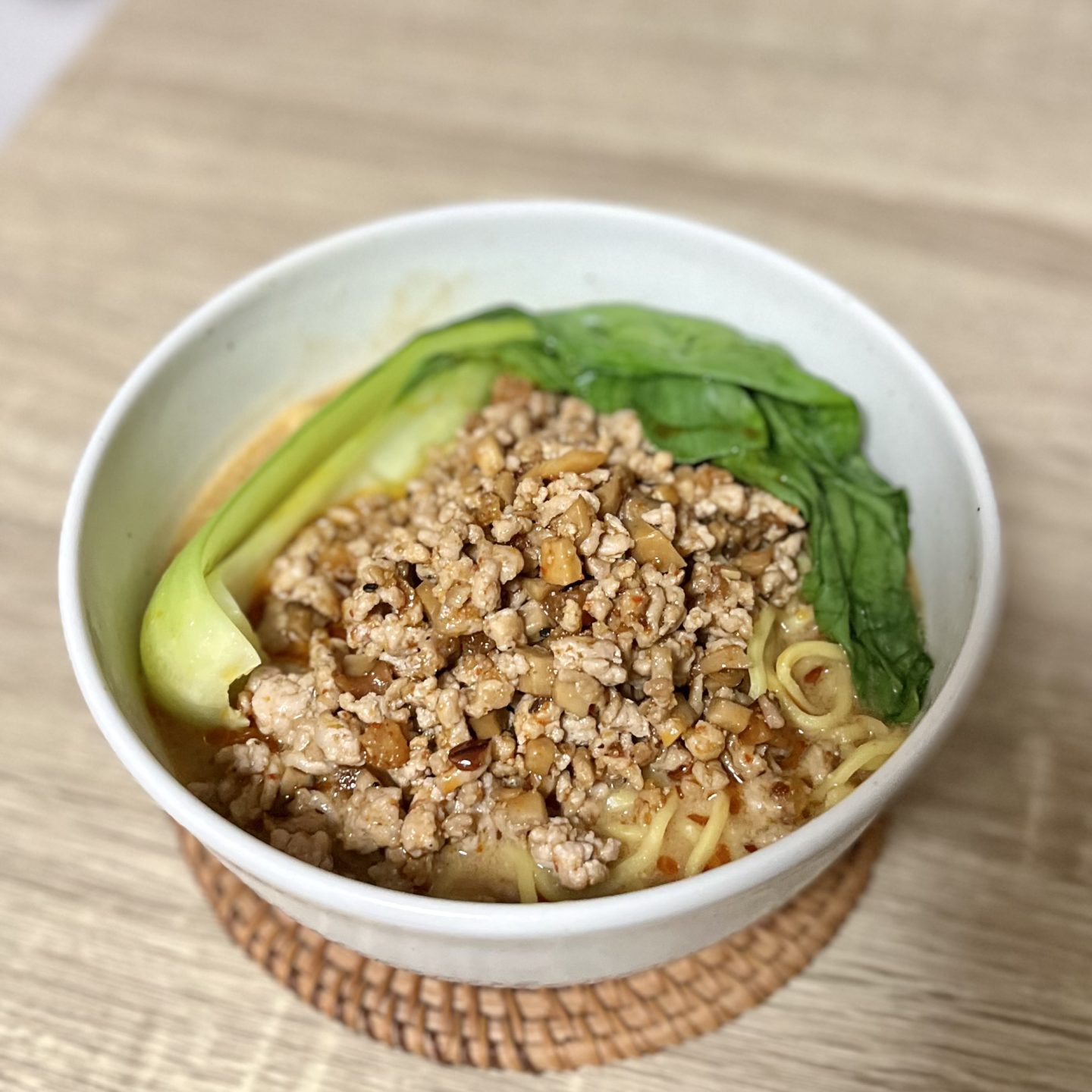 坦々麺ラバーな私。沼津さんのごま油愛がつまった書籍『ごま油さえあれば さっぱりもコク旨も、いつもの家ごはん98』で、この「エリンギの食べるラー油」を使ったアレンジメニューとして紹介されていた「坦々麺」がもう絶品!