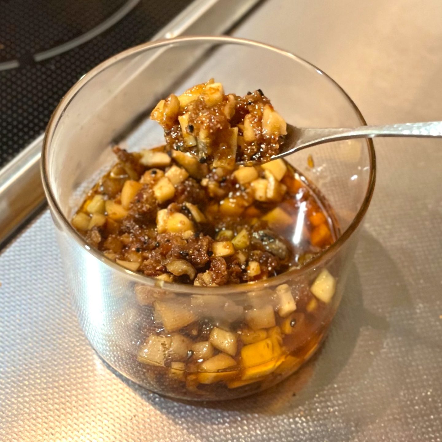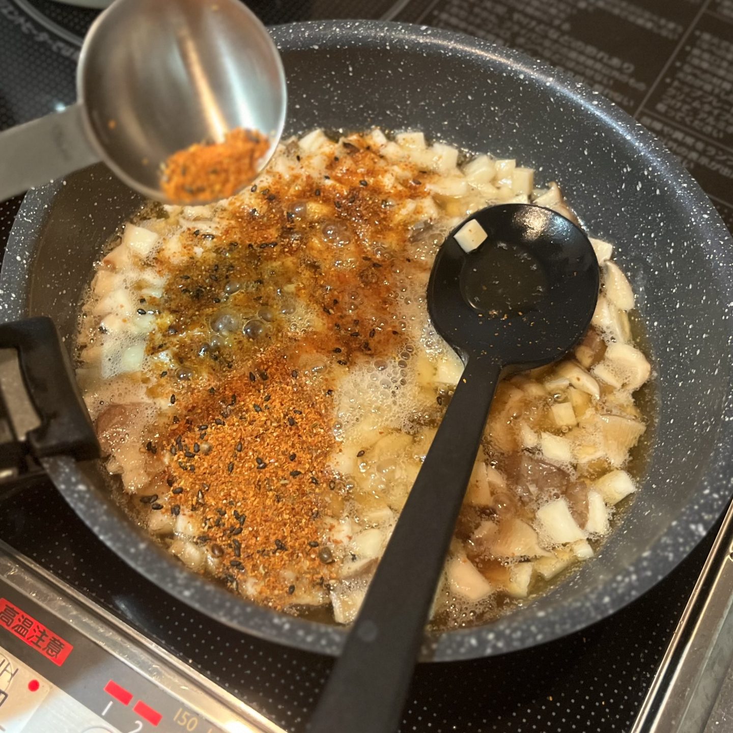 エリンギで作る“食べるラー油”。大きめに切ったエリンギの食感が絶妙で、味付けにみそを使うのもポイント。ほんのり和風のコク旨な食べるラー油です。