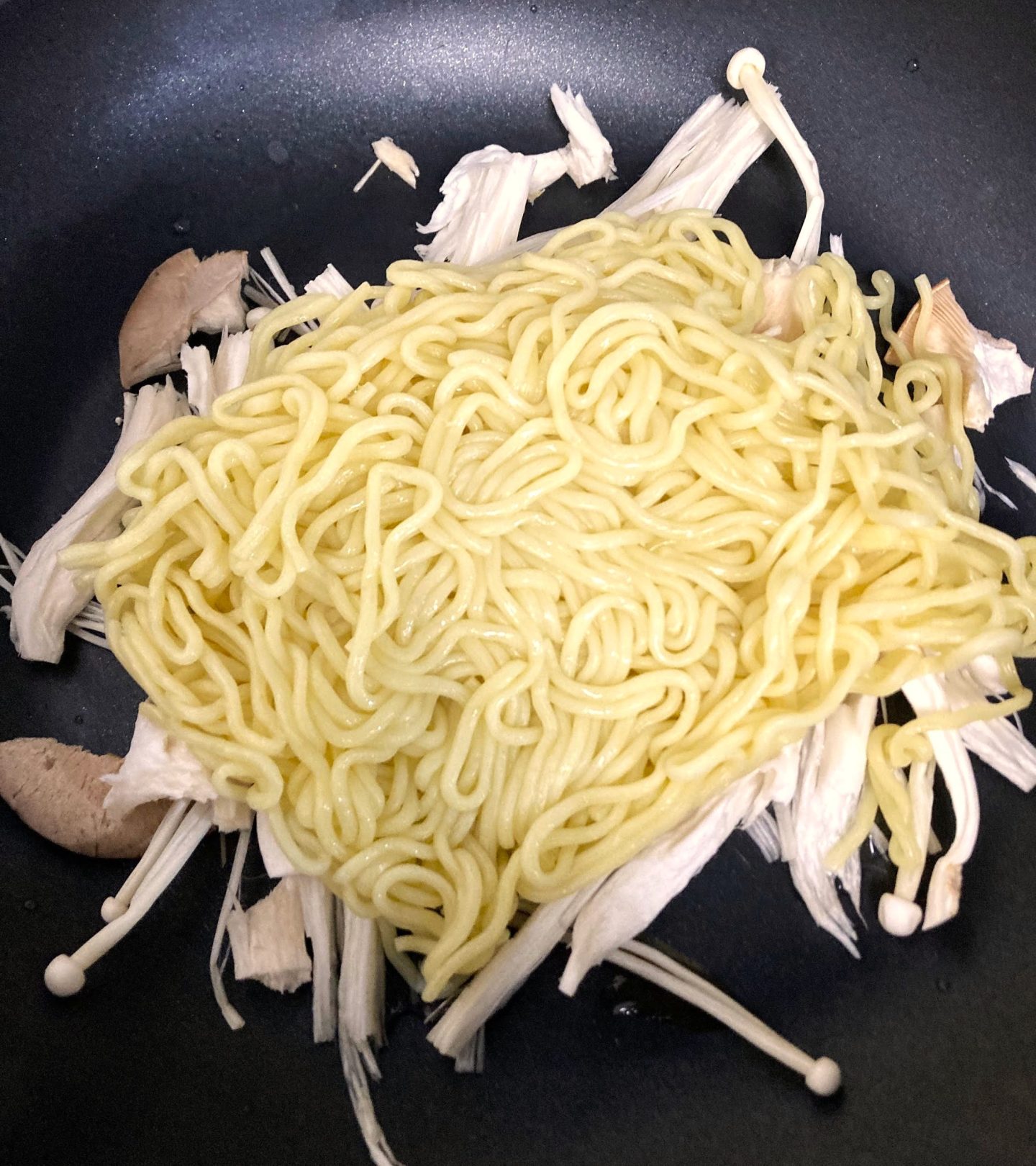 フライパンにごま油を入れ、手で裂いたきのこを加え、電子レンジで約30秒加熱した焼きそば麺をのせて強火にかけます。温まったら酒をかけて蓋をして蒸し焼きに。香ばしい香りがしてきたら、麺の上にオイスターソースをかけほぐしてできあがり。そのままでもコク旨で美味しいのですが、バルサミコ酢をかけるとよりオトナの味わいになります。