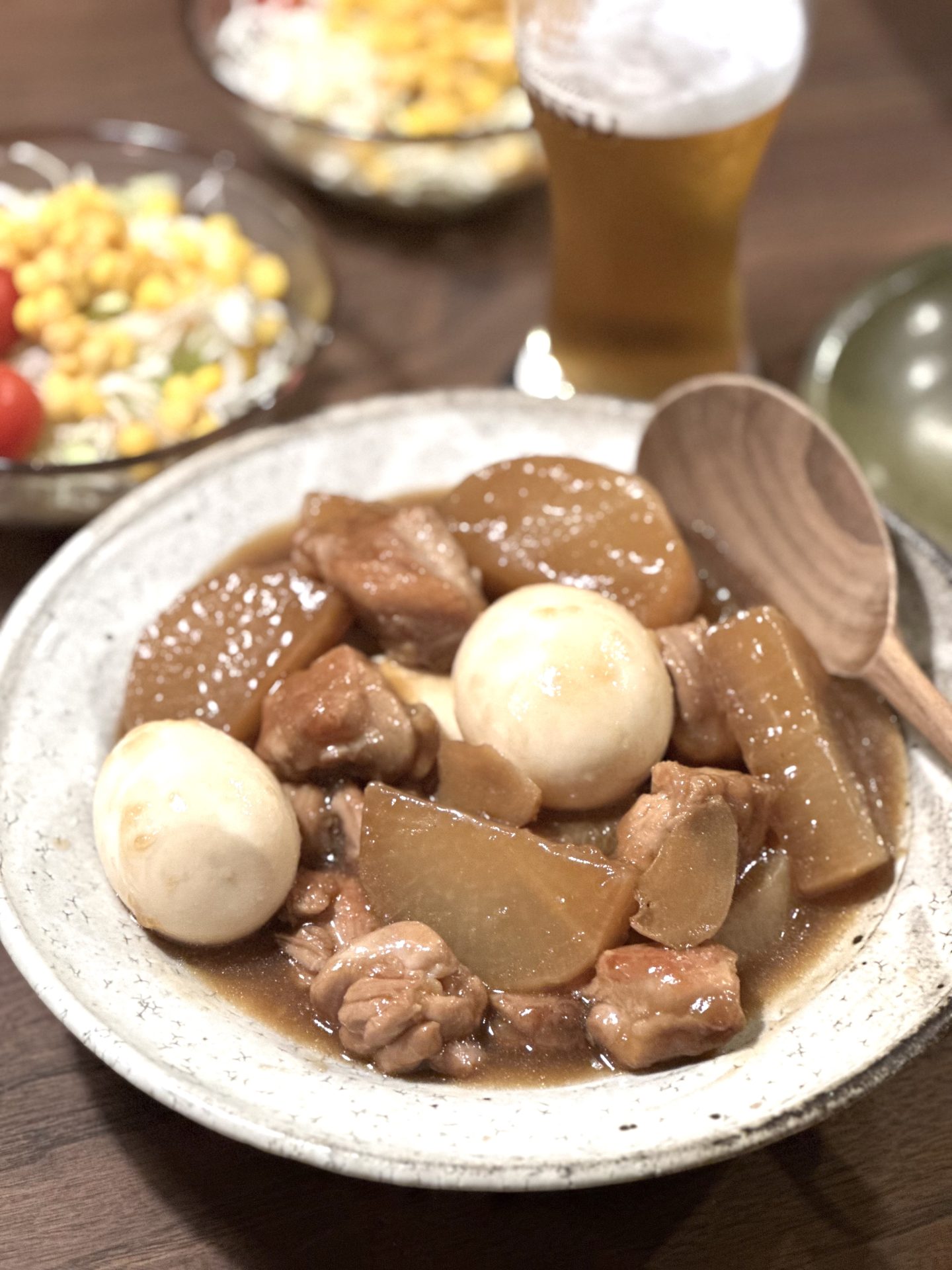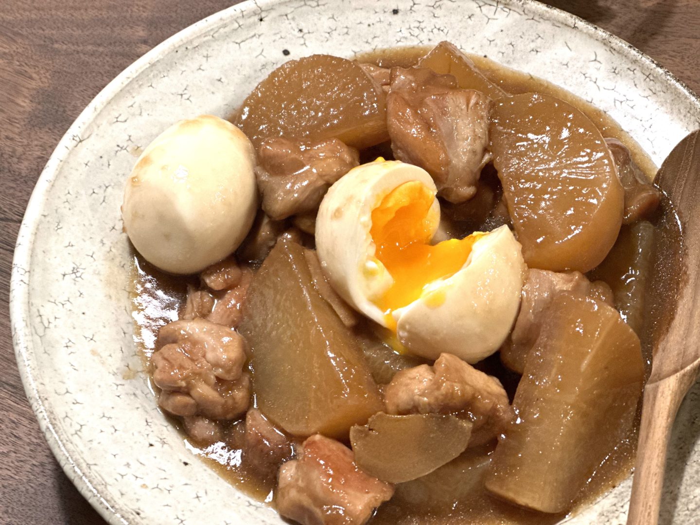 鶏肉に下味をつけてこんがり焼いてから煮込むので、味がしっかり染みて、香ばしくて美味しい。鶏肉はテリッテリ、大根はホロホロ! だしで煮る和風の味付けではなく、ごま油で炒めてから、隠し味にオイスターソースを使うという中華風の味付けなので、ごはんのおかずにもぴったりです。