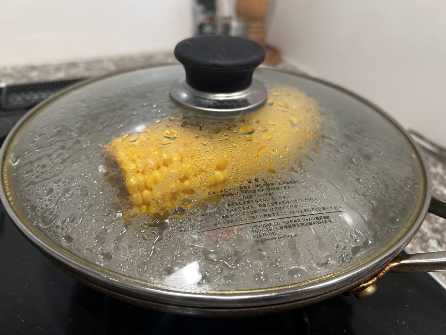 とうもろこしを茹でるには大鍋にたっぷりの水をグラグラするまで沸騰させて……という手順は面倒くさい。それが、フライパンに少量の水を入れるだけで短時間でできちゃうというところが神!