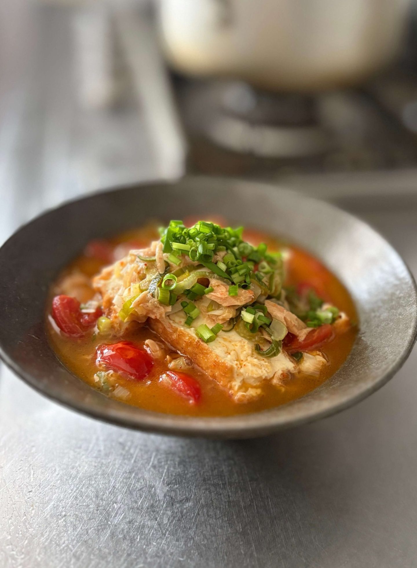 厚揚げに、ツナ缶とミニトマト、長ネギを加えて、鶏がらスープで煮るというこのレシピは、ひと皿でタンパク質も野菜も摂れてヘルシー。体重も、健康も、両方気になる50代のワタシにとっては、悩んだときはコレ!という、お助けレシピになっています。