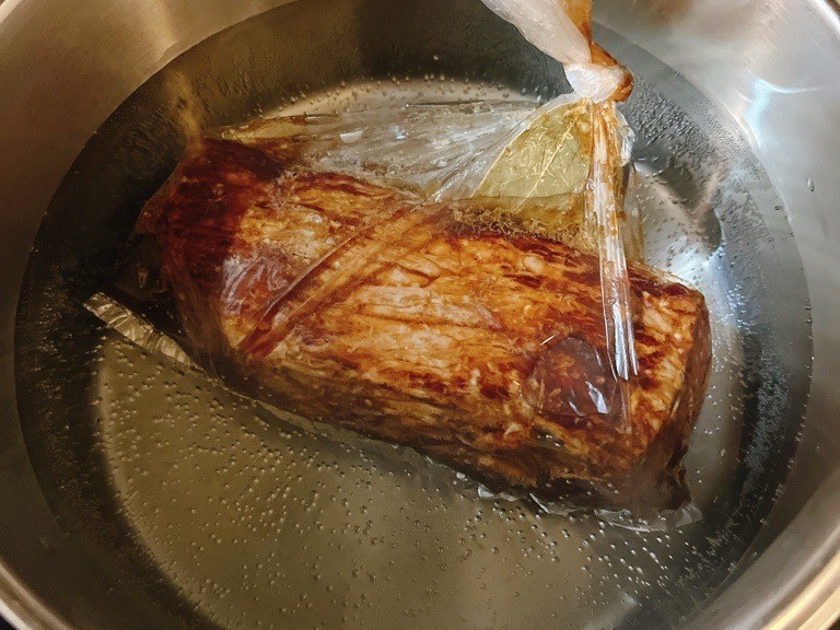 肉に焼き目を付けて→調味液の入った袋(アイラップ使用)に入れて→熱湯にドボン(25分)→引き上げて室温におく(25分)の簡単ステップ。失敗しらずでおいしいロースとビーフが作れる!