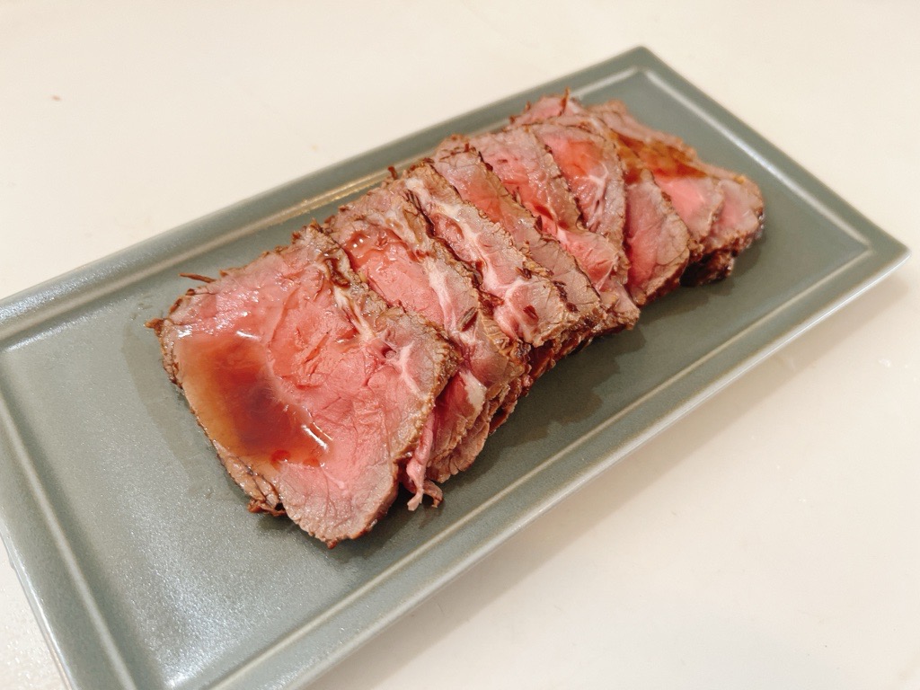 完成したものをカットするときれいなピンク色~! お手頃なお肉でも十分美味しくできます。お客様の時などは、和牛のちょっといいお肉で作ったりもしますが、これももちろん絶品。