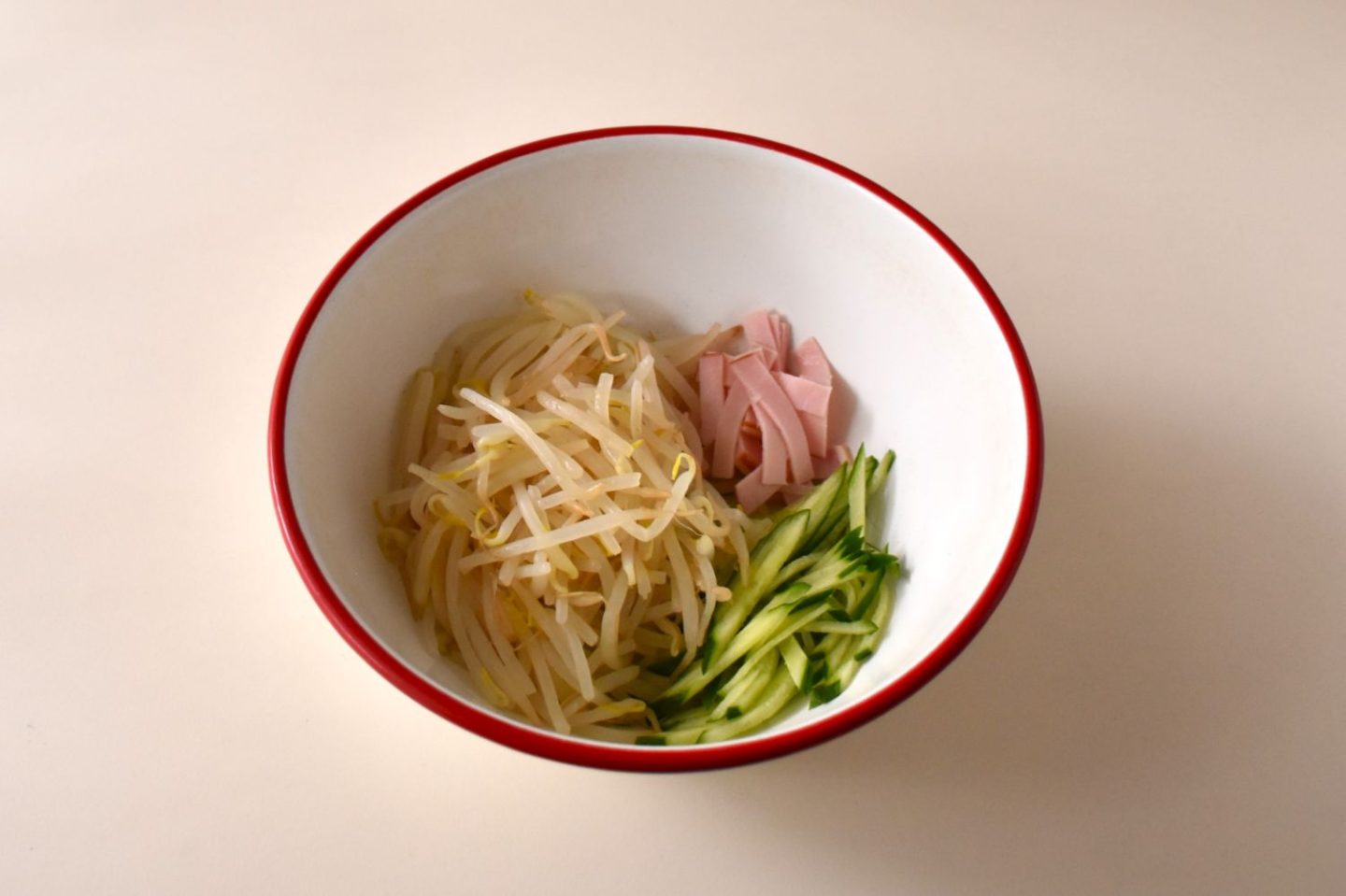ボウルに水気を切ったもやしと細切りにしたきゅうり、短冊切りにしたロースハムを入れます。<調味料>を加えて全体をよく混ぜ合わせます。器に盛り付けたら完成です。
