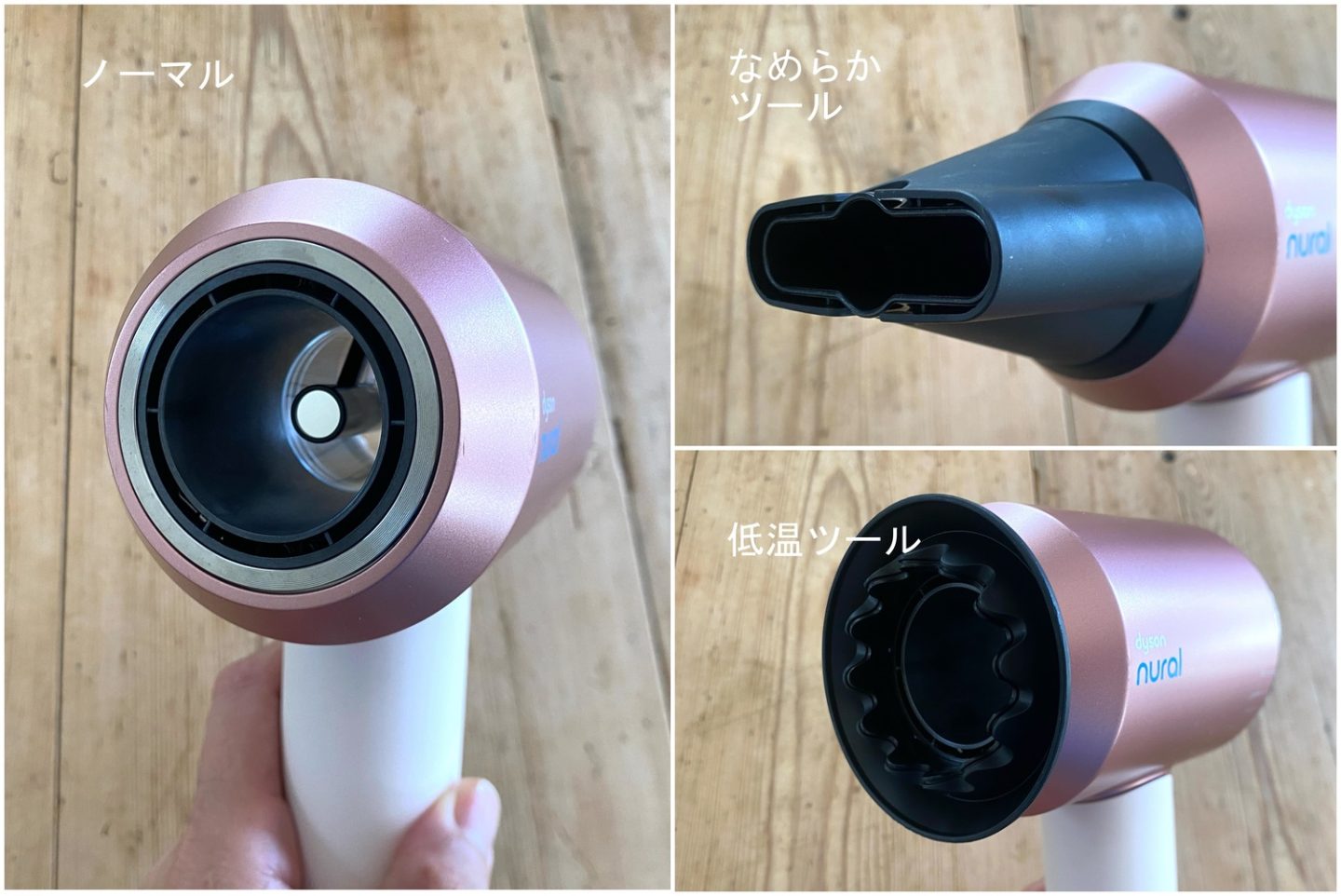 『ダイソン』も3種類のアタッチメントが装備されています。「低温ツール」では子どもの細い髪をやさしく乾かせるし、「なめらかツール」で部分的にセットするのもお手のもの。もっとも便利だったのは、「ツヤ出しツール」。クシとヘアドライを一緒にできる非常に便利なアタッチメントで、角度も動かせるため内側から内巻きに整えるのも簡単でした。