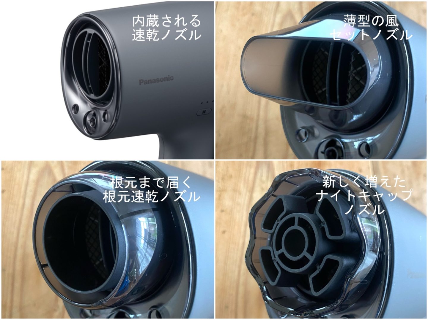 ナイトキャップノズル=髪が7割程度乾いた状態で使用。髪の毛をほぐしながら均一に風を届け、寝ぐせがつきにくくなる。