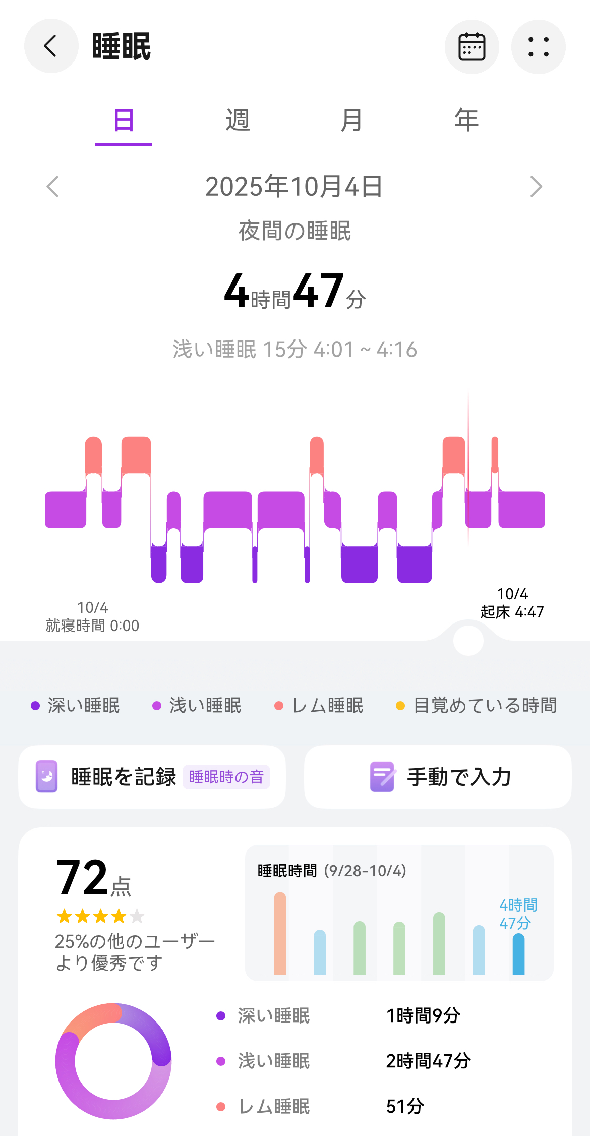 筆者は「昨夜の睡眠の質は平均的でした。4時間47分しか寝ていません。これは平均を大幅に下回っています。これは過去7日間何回も発生しました。長期的な睡眠不足は免疫システムを低下させ、神経衰弱や胃腸疾患につながる可能性があります」と指摘されてしまいました。