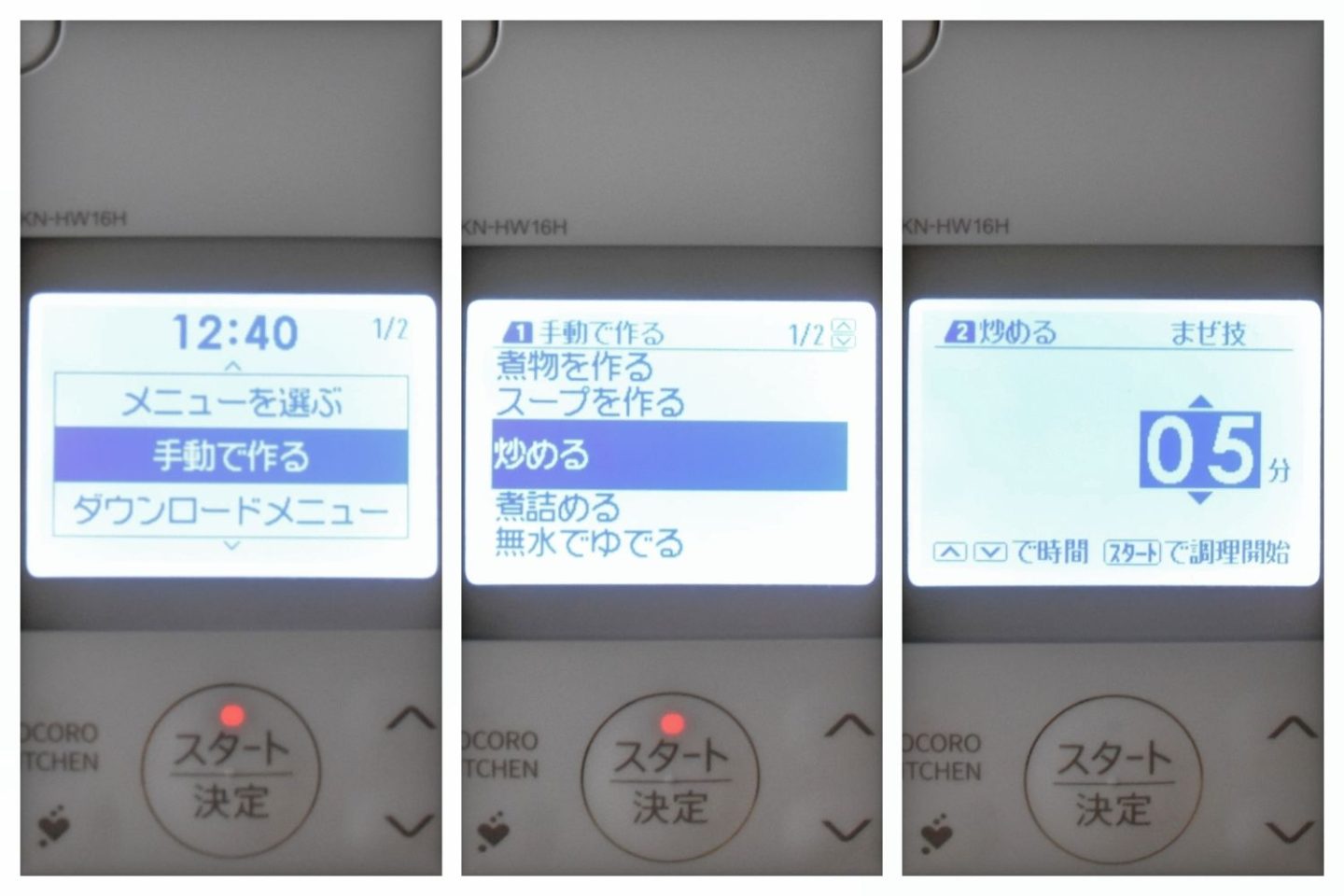 (2)「手動で作る」→「炒める」→「5分」を選んでスタートボタンを押します。