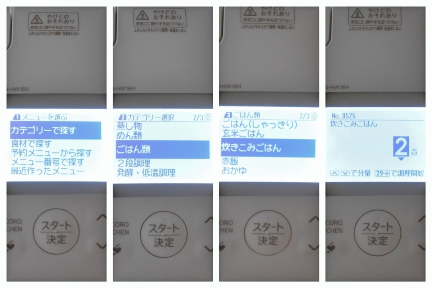 (6)「カテゴリーで探す」→「ごはん類」→「炊き込みごはん」→「2合」を選んでスタートボタンを押します。約55分で完成します。