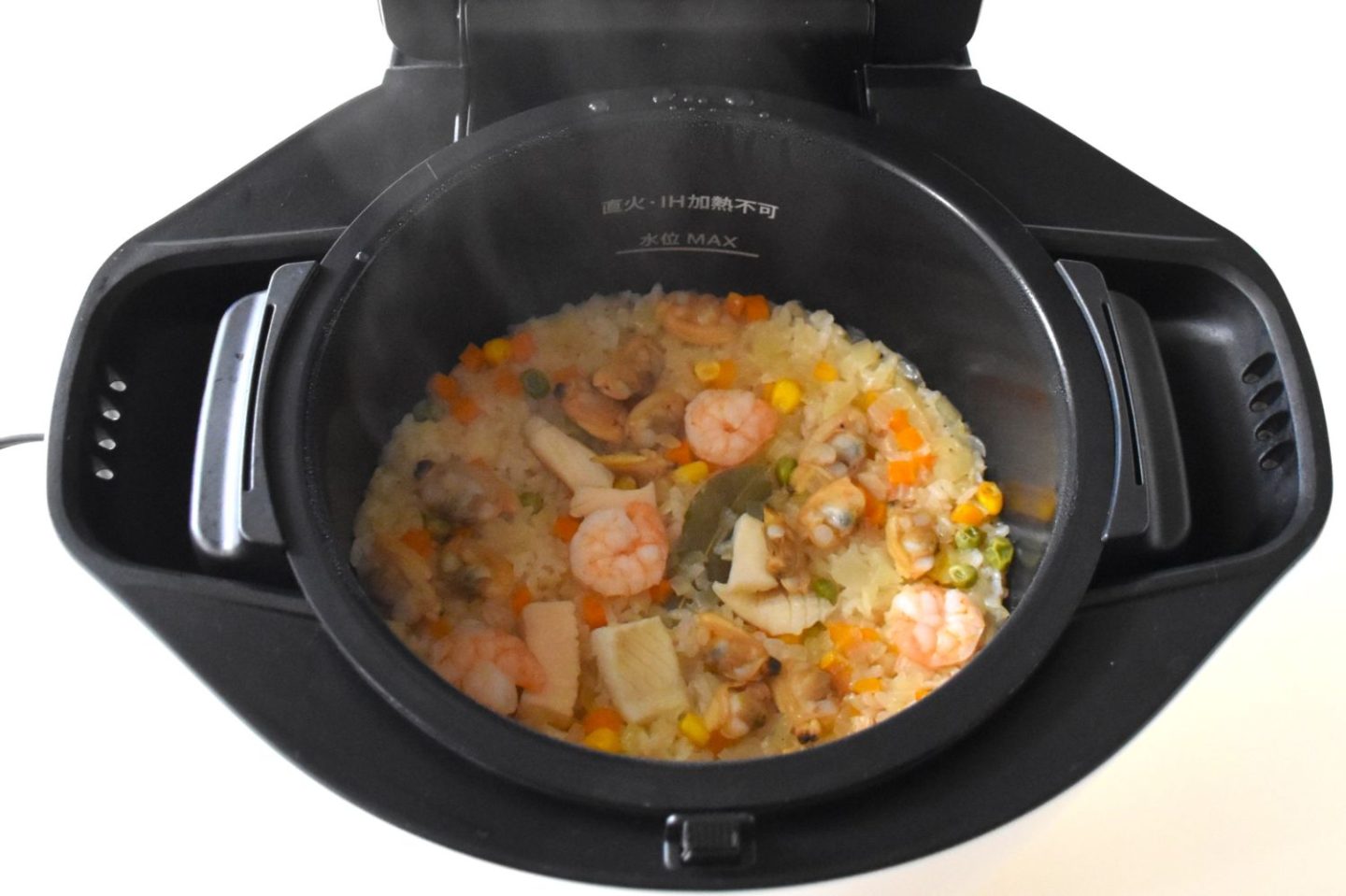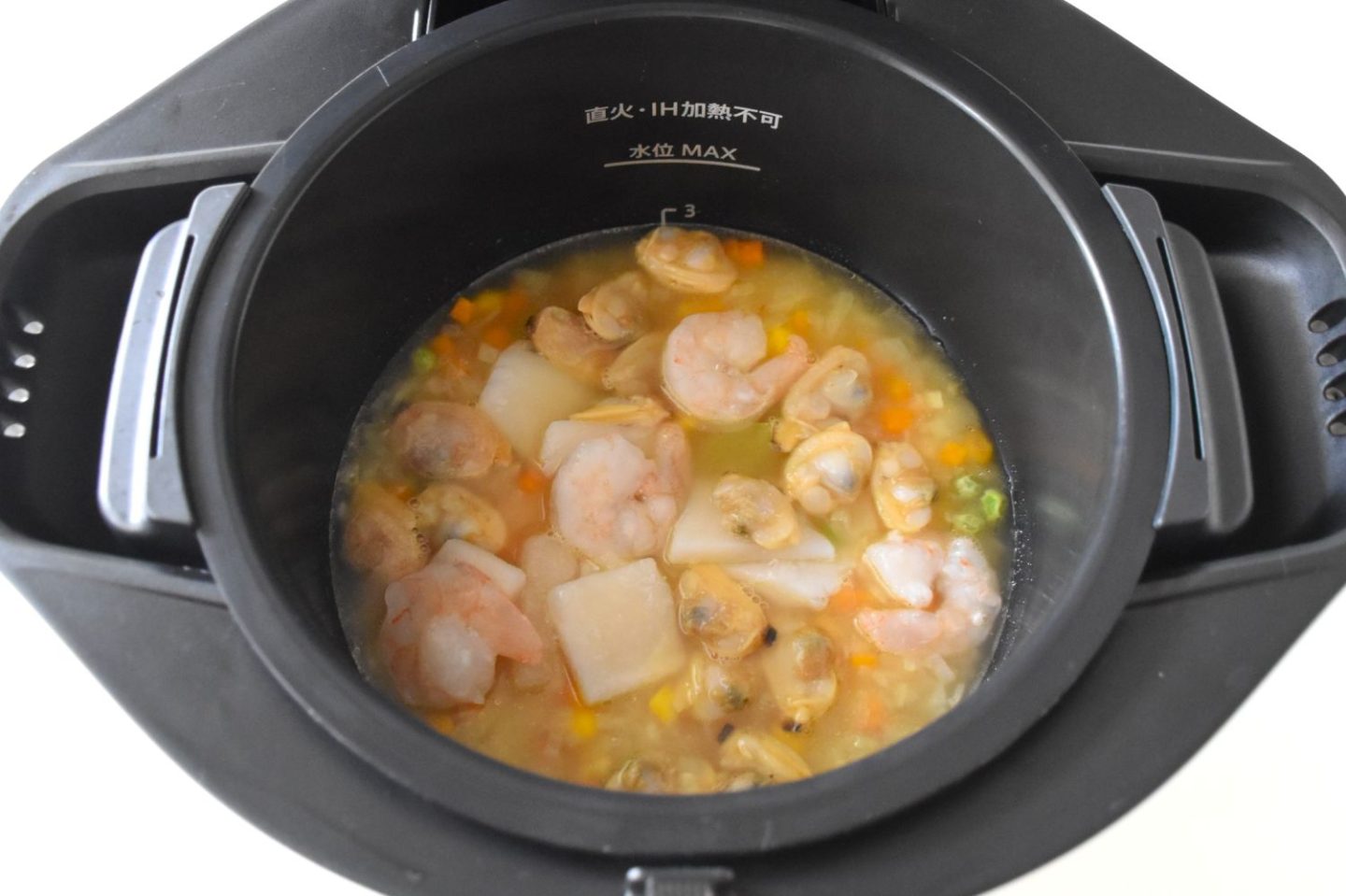 ●ポイント:シーフードミックスは凍ったまま入れてOKです。最初に炒めてしまうと身が固くなるので、炒めずに炊飯します。