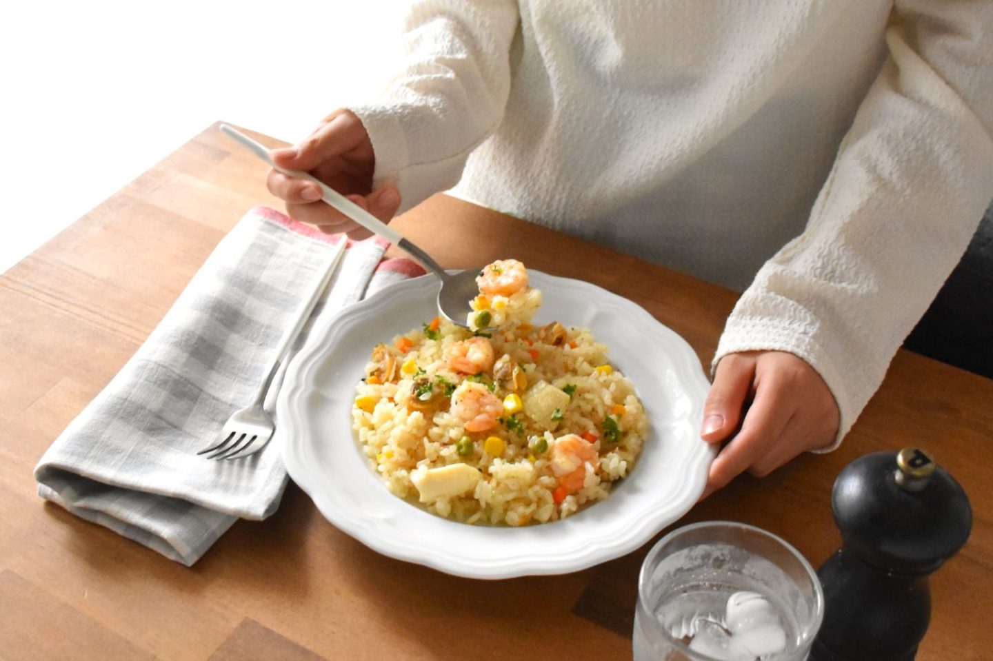 調味料はシンプルですが、シーフードミックスの旨みを吸ったごはんは箸が止まらない美味しさ。ベジタブルミックスを使っているので見た目にもカラフルで食欲をそそります。一皿で魚介も野菜も摂取できて嬉しいですね。娘もエビが好きなので、「エビがプリプリでおいしい!」と好評でした。