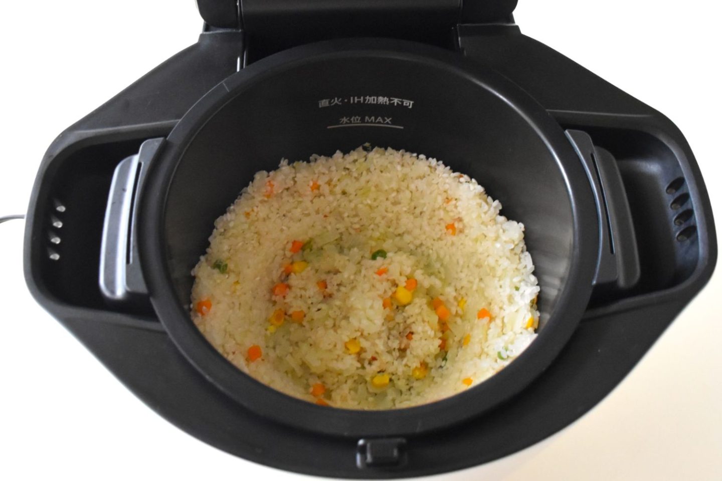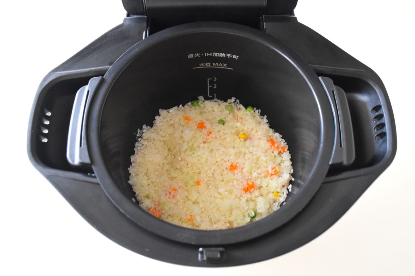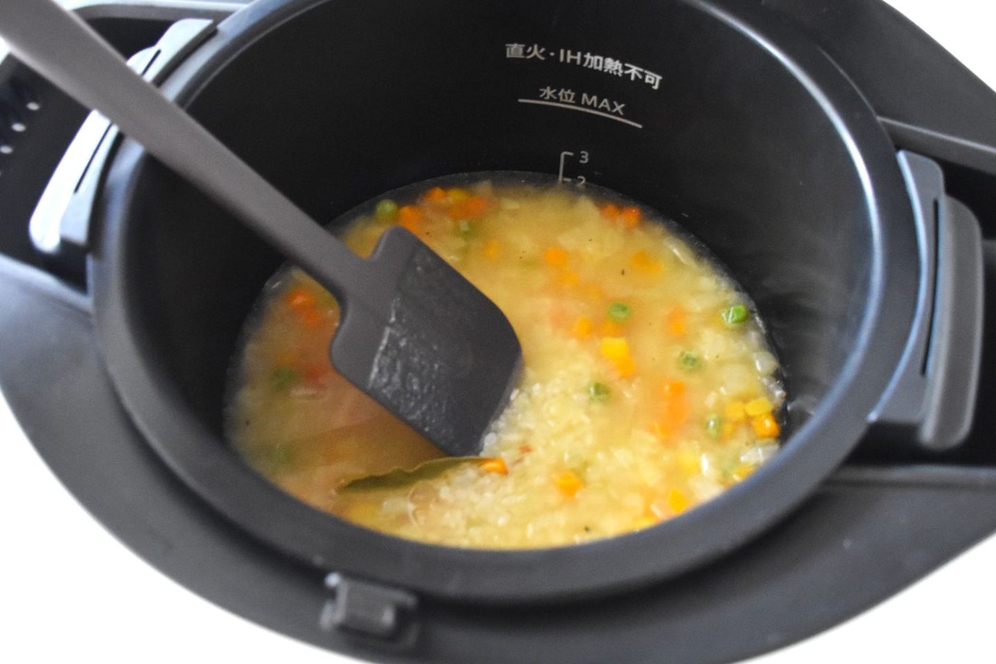 ●ポイント:米は洗わずに使用します。洗った米を使うと、割れやすく、べちゃっとした炊き上がりになってしまいます。ベジタブルミックスは凍ったまま入れてOKです。